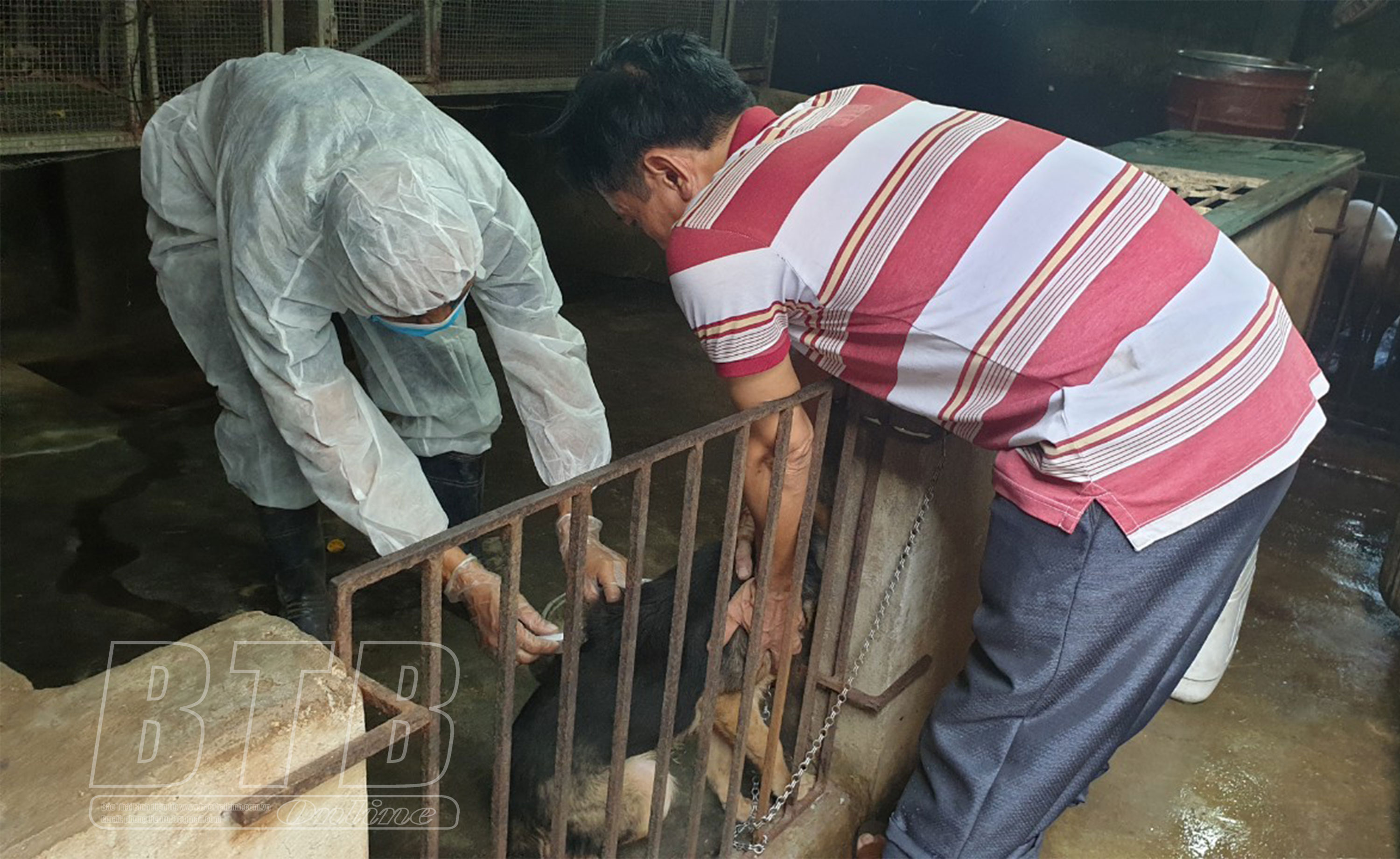 Cán bộ thú y xã Quỳnh Hồng (Quỳnh Phụ) tiêm vắc-xin phòng bệnh cho đàn lợn.