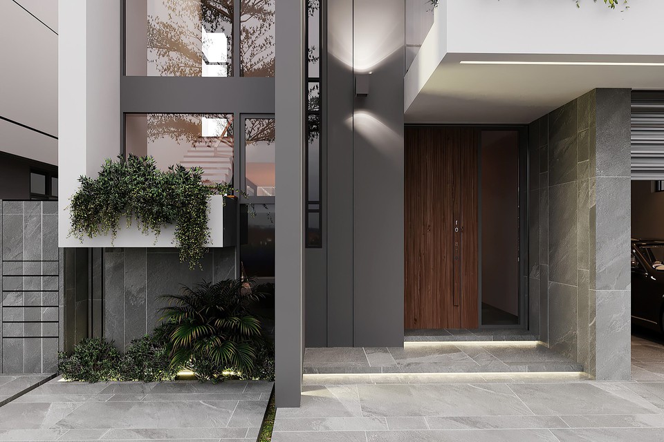 Mặt tiền biệt thự nổi bật với đường nét mạnh mẽ, hiện đại khi được ốp đá marble Pelato (Italy) gam màu trung tính. Theo đại diện dự án Regal Victoria, nhờ hoàn thiện bằng công nghệ Finesse DPR Texture Finishes, Dryvit (Mỹ), bề mặt tường biệt thự hạn chế bám bụi, có thời gian trường tốn đến trăm năm.