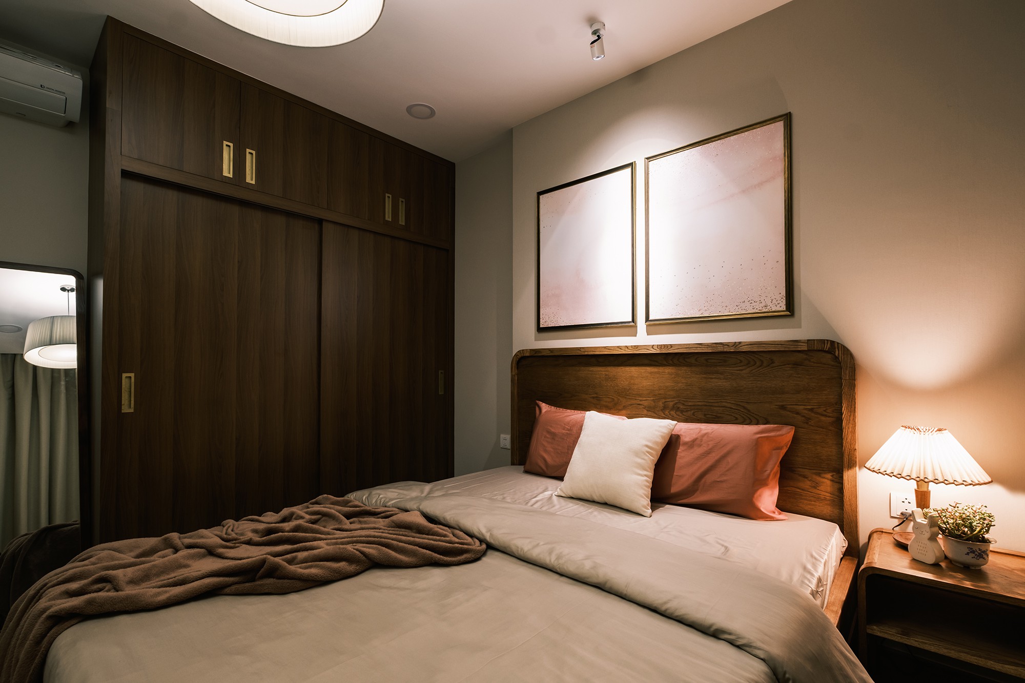Phòng ngủ được trang trí nhiều bức tranh màu be, hồng. Phòng ngủ sử dụng dàn nội thất đơn giản, nhiều nét bo tròn, đầy đặn để tăng thêm sự ấm cúng. Căn nhà có 3 chế độ ánh sáng khác nhau là thư giãn, tiếp khách và thân mật. Đèn có phom tròn sao cho phù hợp với thiết kế và nội thất.