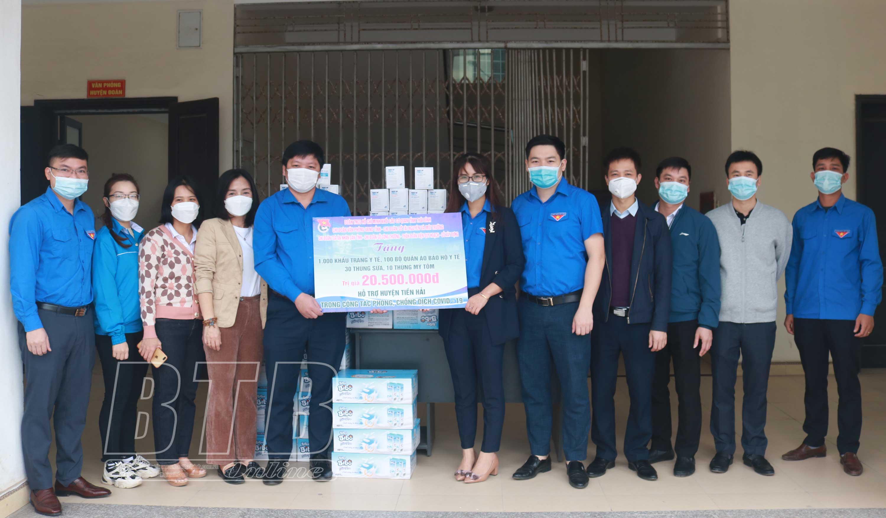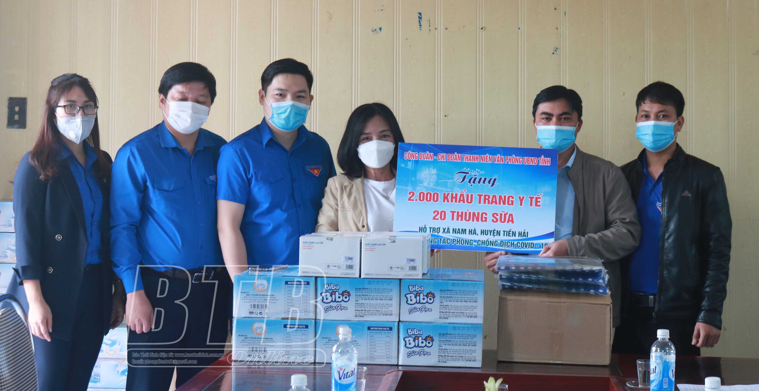 Sáng cùng ngày, Đoàn Thanh niên Khối các cơ quan tỉnh và một số chi đoàn trực thuộc Đoàn khối cũng tổ chức trao 100 bộ quần áo bảo hộ y tế, 1.000 khẩu trang kháng khuẩn, 30 thùng sữa, 10 thùng mì tôm, trị giá hơn 20 triệu đồng hỗ trợ huyện Tiền Hải phòng, chống dịch Covid-19.
