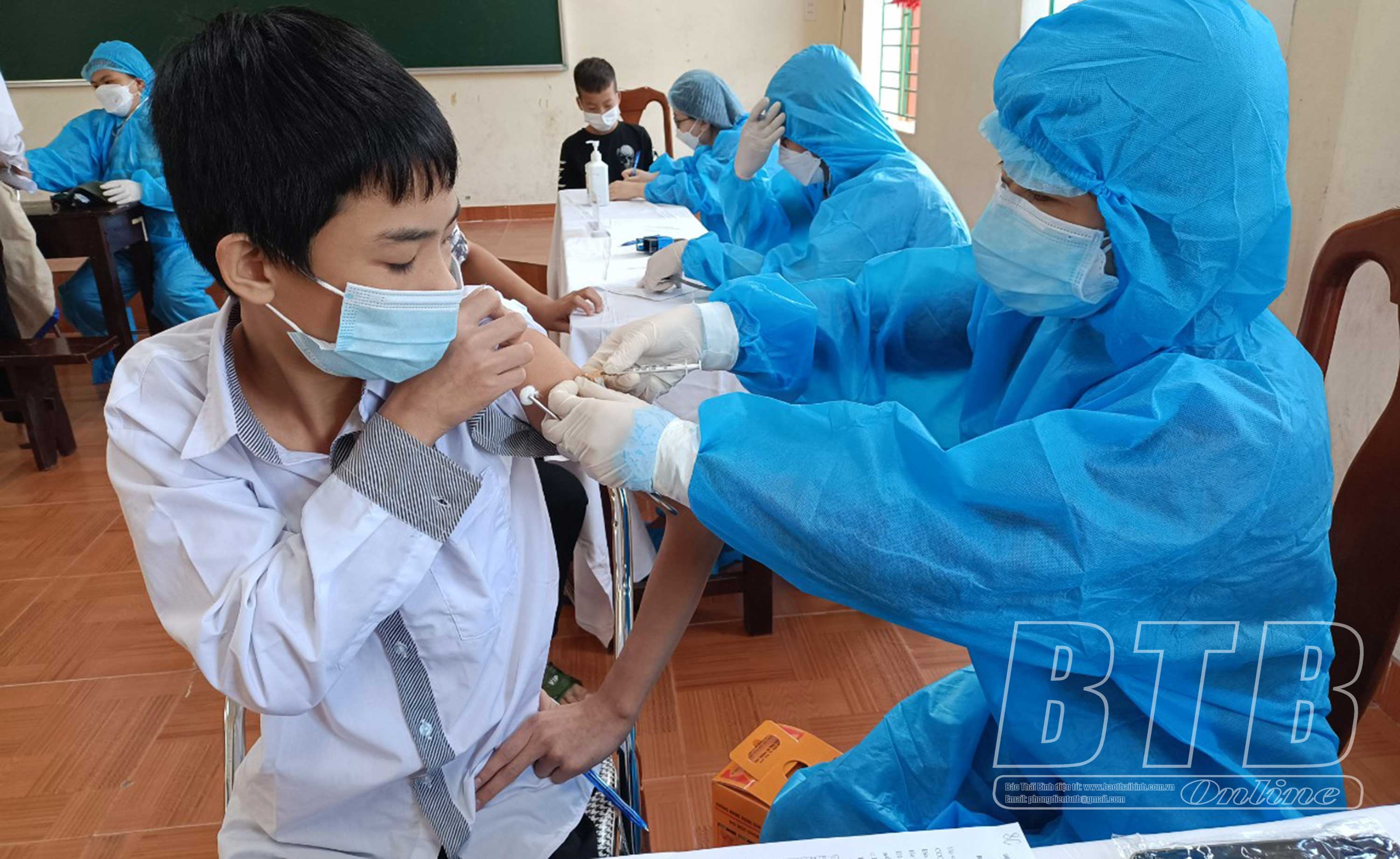 Trong đó, huyện Kiến Xương tiêm cho trẻ từ 12-17 tuổi; 5 huyện còn lại là Đông Hưng, Tiền Hải, Hưng Hà, Quỳnh Phụ và Thái Thụy sẽ tiêm cho trẻ từ 15-17 tuổi. Vắc-xin được sử dụng tiêm là vắc-xin Pfizer đã được Bộ Y tế phê duyệt. Trẻ sẽ được tiêm 2 mũi, cách nhau từ 3-4 tuần. Các điểm tiêm chủng đều được đặt ngay tại trường học, bảo đảm giãn cách, các học sinh được bố trí tiêm theo từng khối lớp.