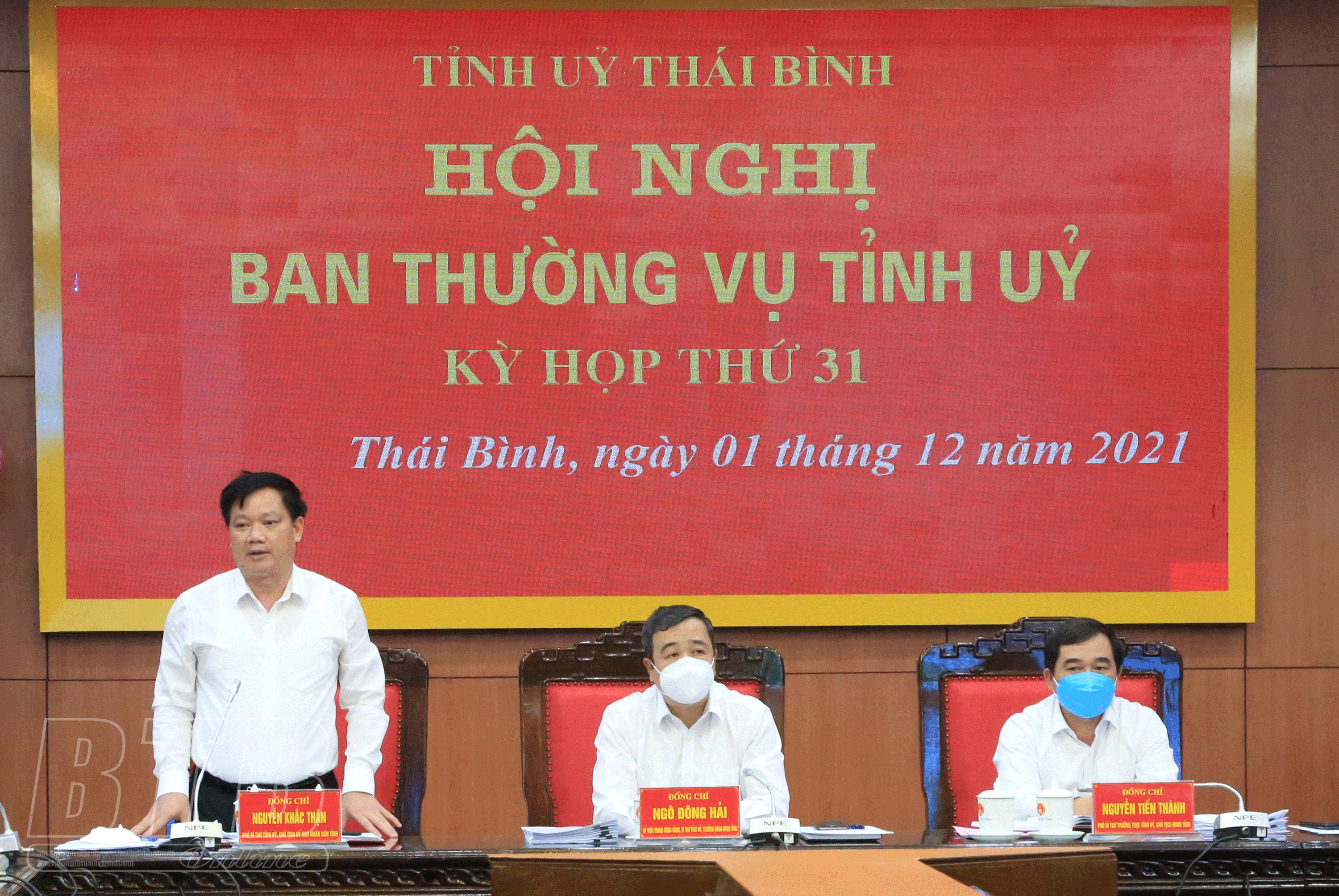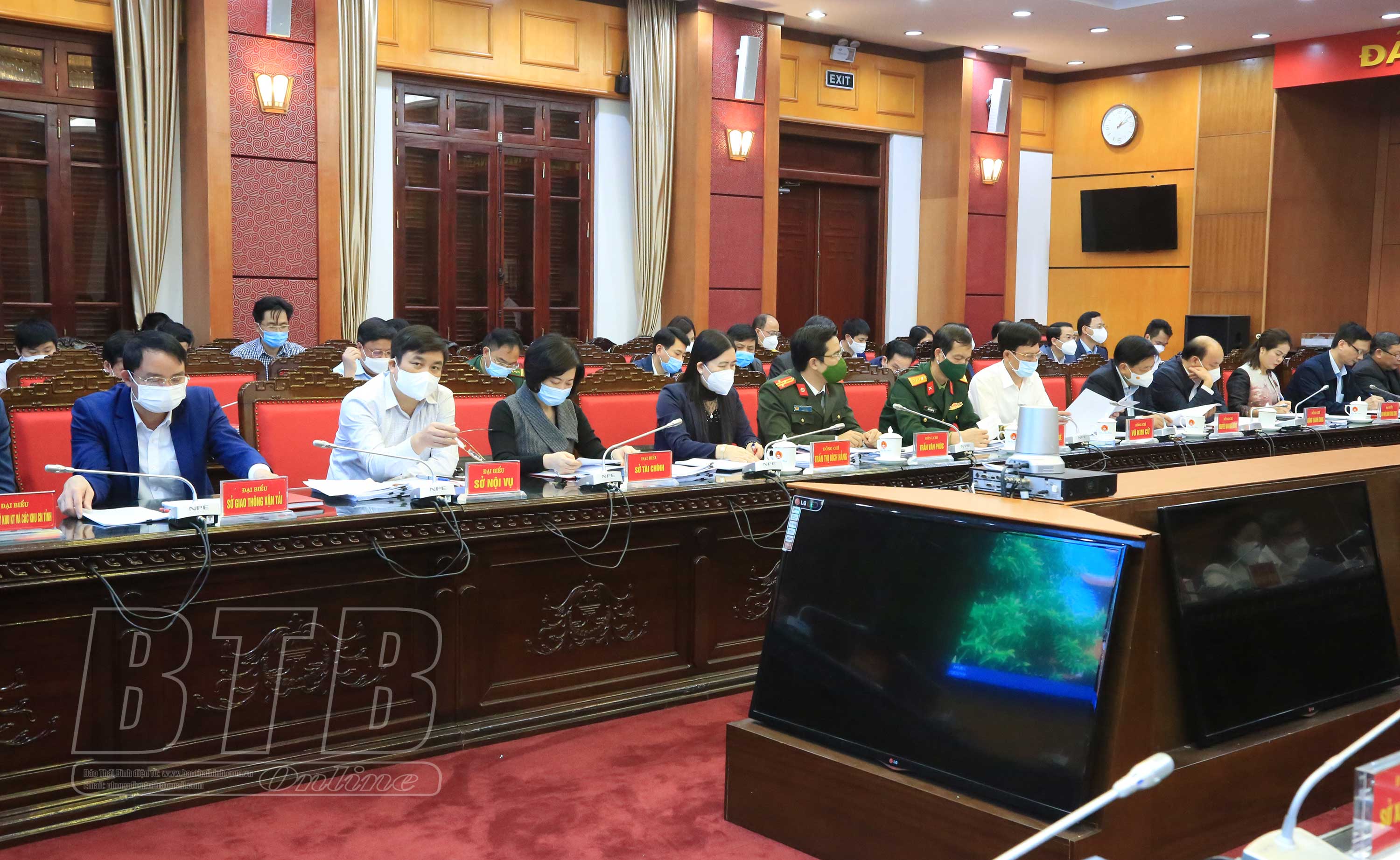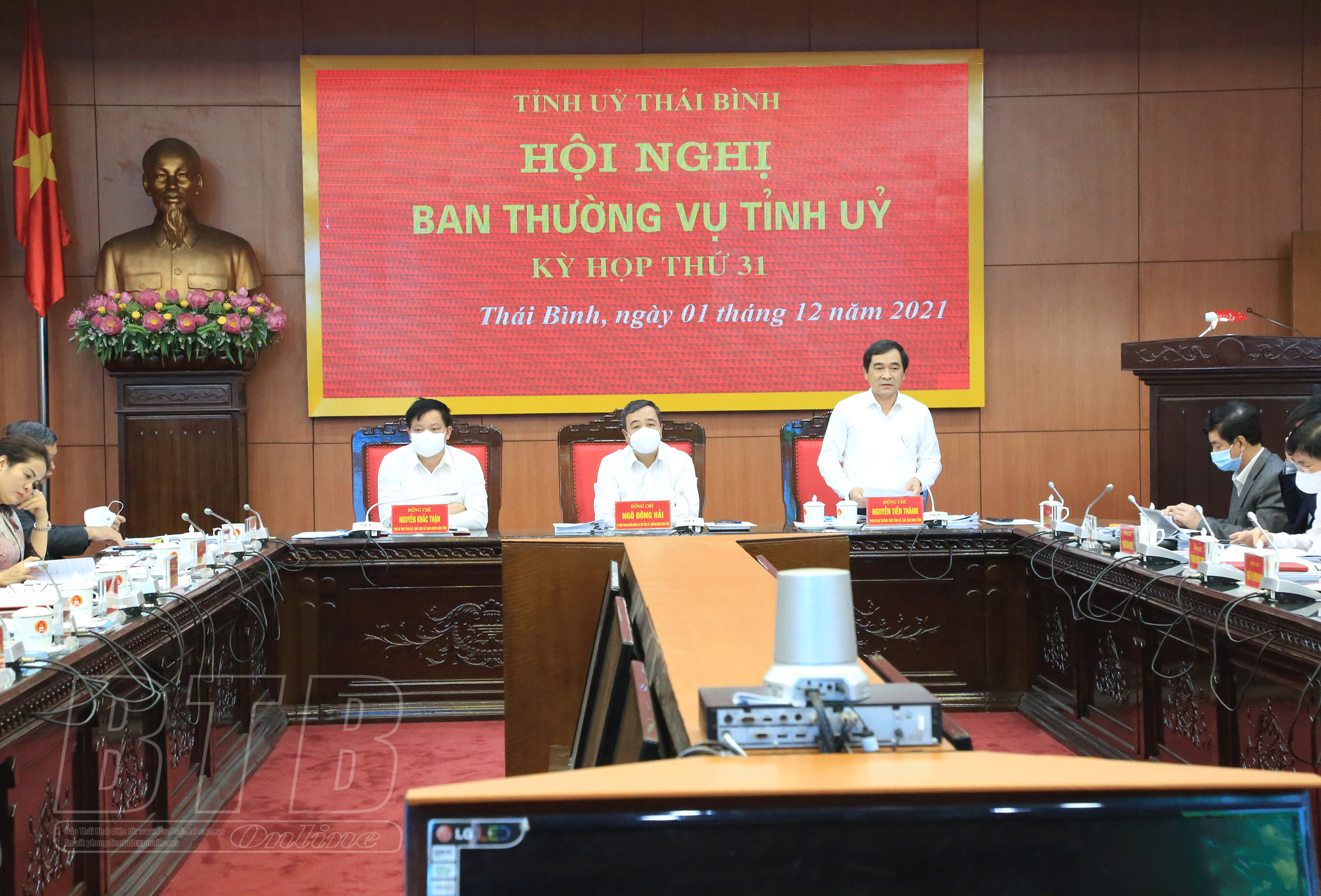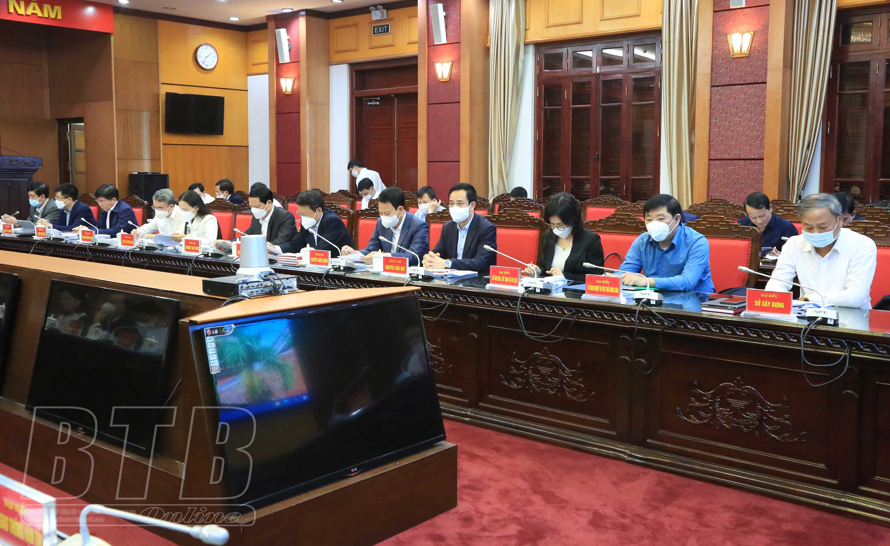 * Trước đó trong buổi sáng, dưới sự chủ trì của các đồng chí: Nguyễn Tiến Thành, Phó Bí thư thường trực Tỉnh ủy, Chủ tịch HĐND tỉnh; Nguyễn Khắc Thận, Phó Bí thư Tỉnh ủy, Chủ tịch UBND tỉnh, Ban Thường vụ Tỉnh ủy thảo luận các dự thảo báo cáo: phân cấp nguồn thu, nhiệm vụ chi và tỷ lệ phần trăm phân chia nguồn thu giữa các cấp ngân sách ở địa phương giai đoạn 2022 - 2025, việc ban hành các nguyên tắc, tiêu chí và định mức phân bổ dự toán chi thường xuyên ngân sách nhà nước năm 2022 các cấp ngân sách của chính quyền địa phương; cơ chế, chính sách hỗ trợ dự án đầu tư xử lý rác thải sinh hoạt tập trung trên địa bàn tỉnh giai đoạn 2021 - 2025; cơ chế chính hỗ trợ lĩnh vực nông nghiệp, nông thôn trên địa bàn tỉnh giai đoạn 2021 - 2025; báo cáo về biên chế công chức, số lượng người làm việc trong các cơ quan, tổ chức hành chính và các đơn vị sự nghiệp công lập năm 2022; đề án hỗ trợ, nâng cao hiệu quả hoạt động của mô hình nhà văn hóa, khu thể thao thôn, tổ dân phố trên địa bàn tỉnh Thái Bình giai đoạn 2021-2025; quy trình giải quyết khiếu nại kỷ luật đảng của Ban Chấp hành Đảng bộ tỉnh, Ban Thường vụ Tỉnh ủy; dự thảo báo cáo kết luận cuộc kiểm tra của Ban Thường vụ Tỉnh ủy về kiểm tra việc lãnh đạo, chỉ đạo, quản lý, sử dụng tài chính, tài sản công và nguồn vốn đầu tư thuộc ngân sách nhà nước trên địa bàn tỉnh Thái Bình.