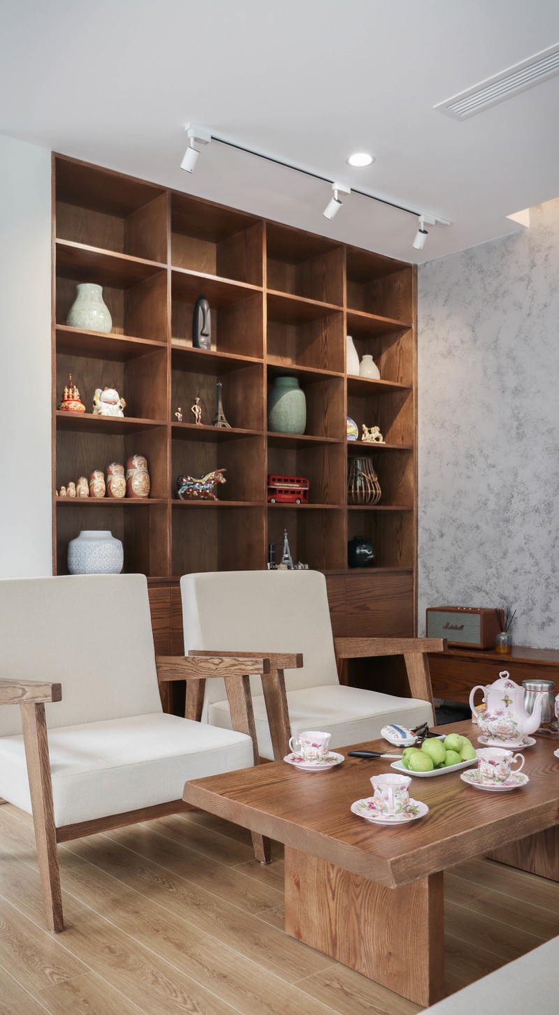 Phòng khách thể hiện tinh thần tối giản với sofa gỗ màu nâu nhạt, đồ decor hạn chế ở mức tối đa.