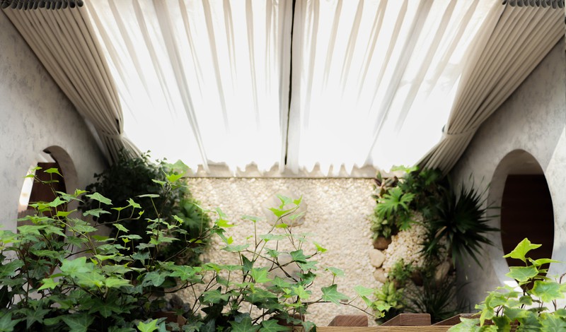 Không gian thông tầng nhìn từ trên cao xuống, ngoài thảm thực vật bao phủ, ở đây được làm thêm tấm kính lớn lấy ánh sáng cho cây quang hợp, cũng như mở rộng không gian về mặt thị giác.