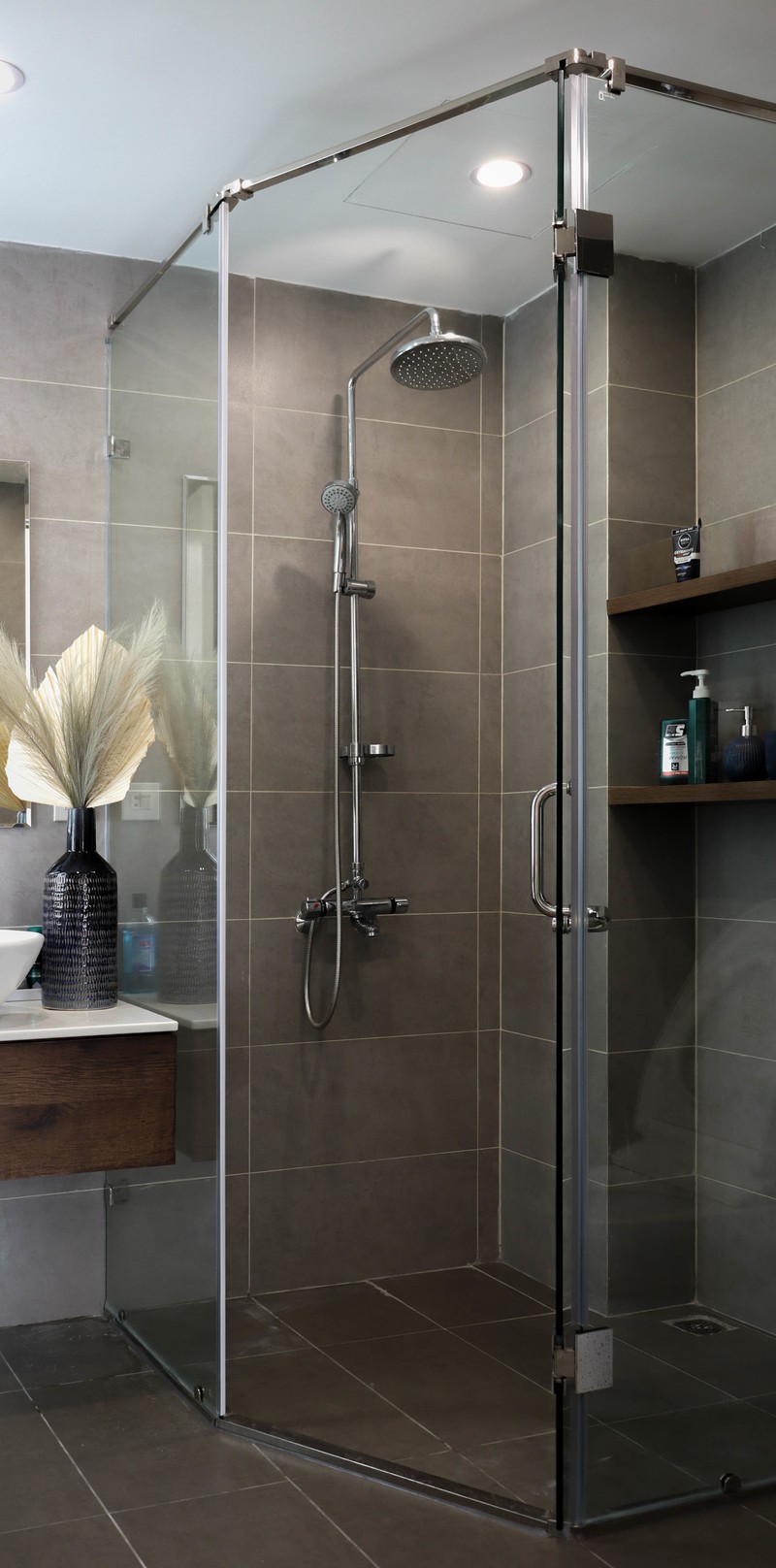 Phòng vệ sinh dùng nền gạch gam tối, phù hợp với tổng thể chung của nhà.
