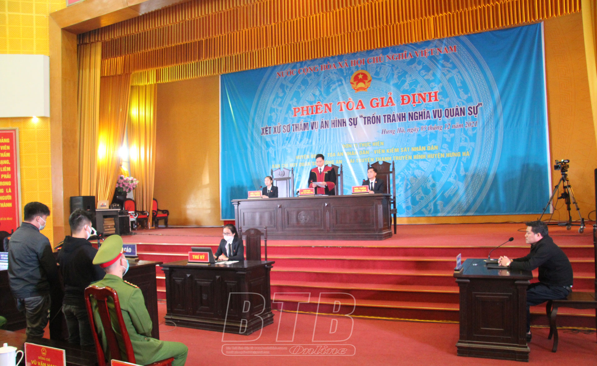 Nội dung vụ án của phiên tòa giả định được xây dựng theo tình huống: Ngày 10/10/2020, Nguyễn Văn Công và Vũ Văn Quân đều sinh năm 2002 ở thị trấn Hưng Hà vi phạm hành chính về hành vi không chấp hành lệnh gọi khám sức khỏe thực hiện nghĩa vụ quân sự. Ngày 29/9/2021, Công và Quân lại có hành vi gian dối, nhờ Trần Hải Thành (sinh năm 2002, thôn La, xã Thái Phương) và Lê Văn Đạt (sinh năm 2001, thôn Bằng, xã Minh Khai) là những người có sức khỏe không đủ tiêu chuẩn thực hiện nghĩa vụ quân sự, đi khám sức khỏe thực hiện nghĩa vụ quân sự tại UBND xã Hòa Bình thay Công và Quân, nhằm trốn tránh nghĩa vụ quân sự. Hành vi của Công và Quân đã phạm vào tội trốn tránh nghĩa vụ quân sự. Căn cứ tại khoản 1, Điều 332, Bộ luật Hình sự, Hội đồng xét xử đã tuyên phạt Nguyễn Văn Công và Vũ Văn Quân mỗi người 1 năm tù giam về tội trốn tránh nghĩa vụ quân sự. Đối với Trần Hải Thành và Lê Văn Đạt là người đi khám sức khỏe nghĩa vụ quân sự thay cho Công và Quân, bị xử phạt hành chính.