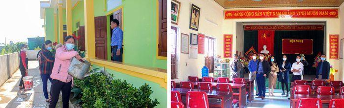 Người dân thôn 10, xã Ngọc Sơn (Quỳnh Lưu) chăm sóc cây cảnh trong khuôn viên Nhà văn hóa thôn; Đoàn công tác tỉnh, huyện kiểm tra xây dựng thiết chế văn hóa tại xã Ngọc Sơn. Ảnh: Thu Hương