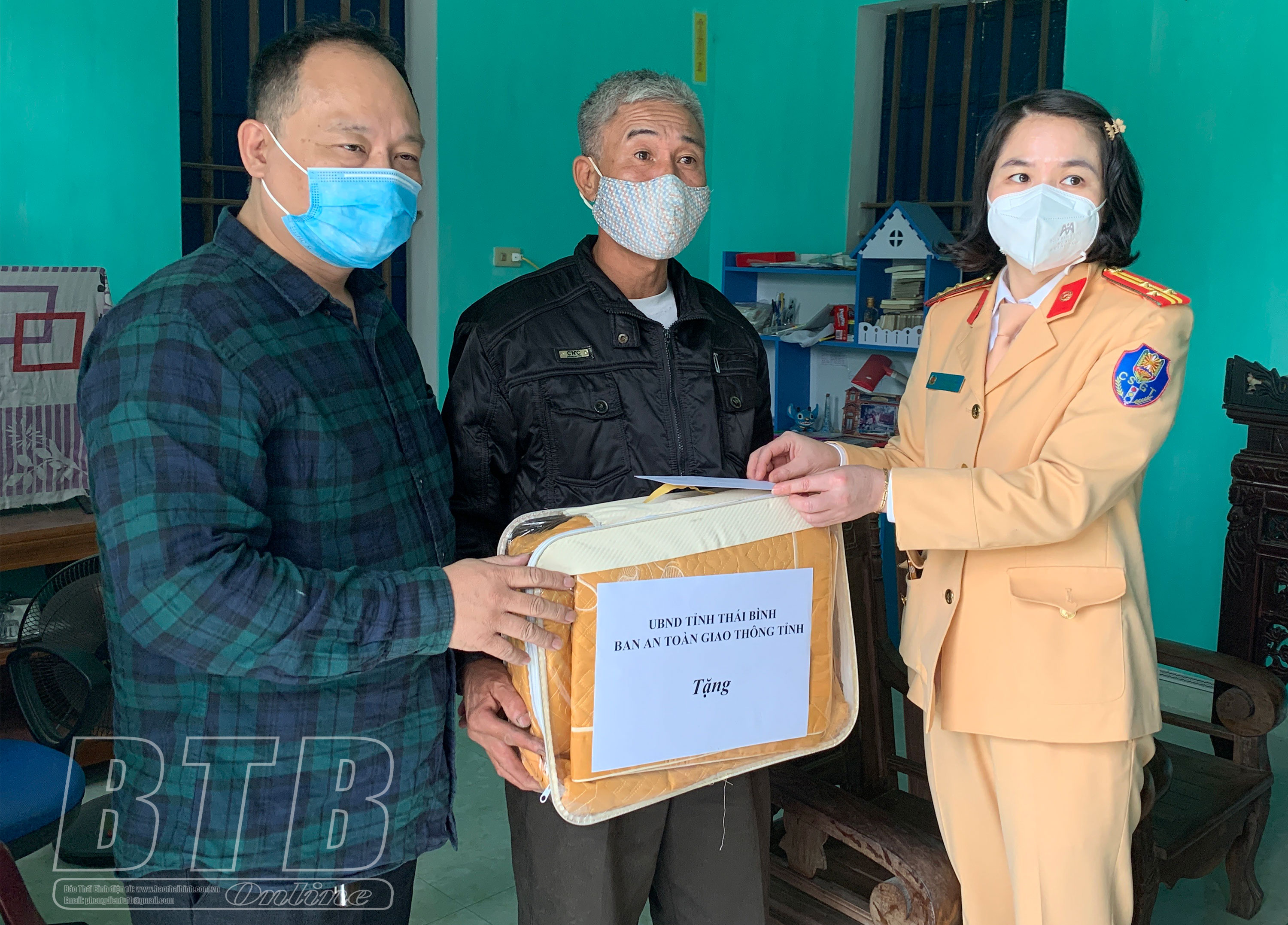 Tại Đông Hưng, đại diện Ban ATGT tỉnh, Ban ATGT huyện đã đến thăm hỏi, tặng quà ông Lê Thanh Hải, trú tại thôn Thống Nhất, xã Liên Hoa, Đông Hưng, (chồng của nạn nhân Bùi Thị Huế bị tai nạn giao thông thiệt mạng năm 2020).