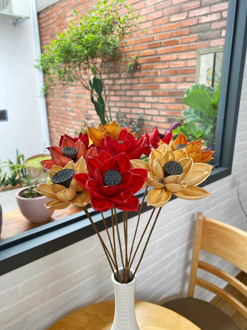 Hoa sen giả và cành hồng khô anh Tuấn tự làm từ các đồ tái chế.
