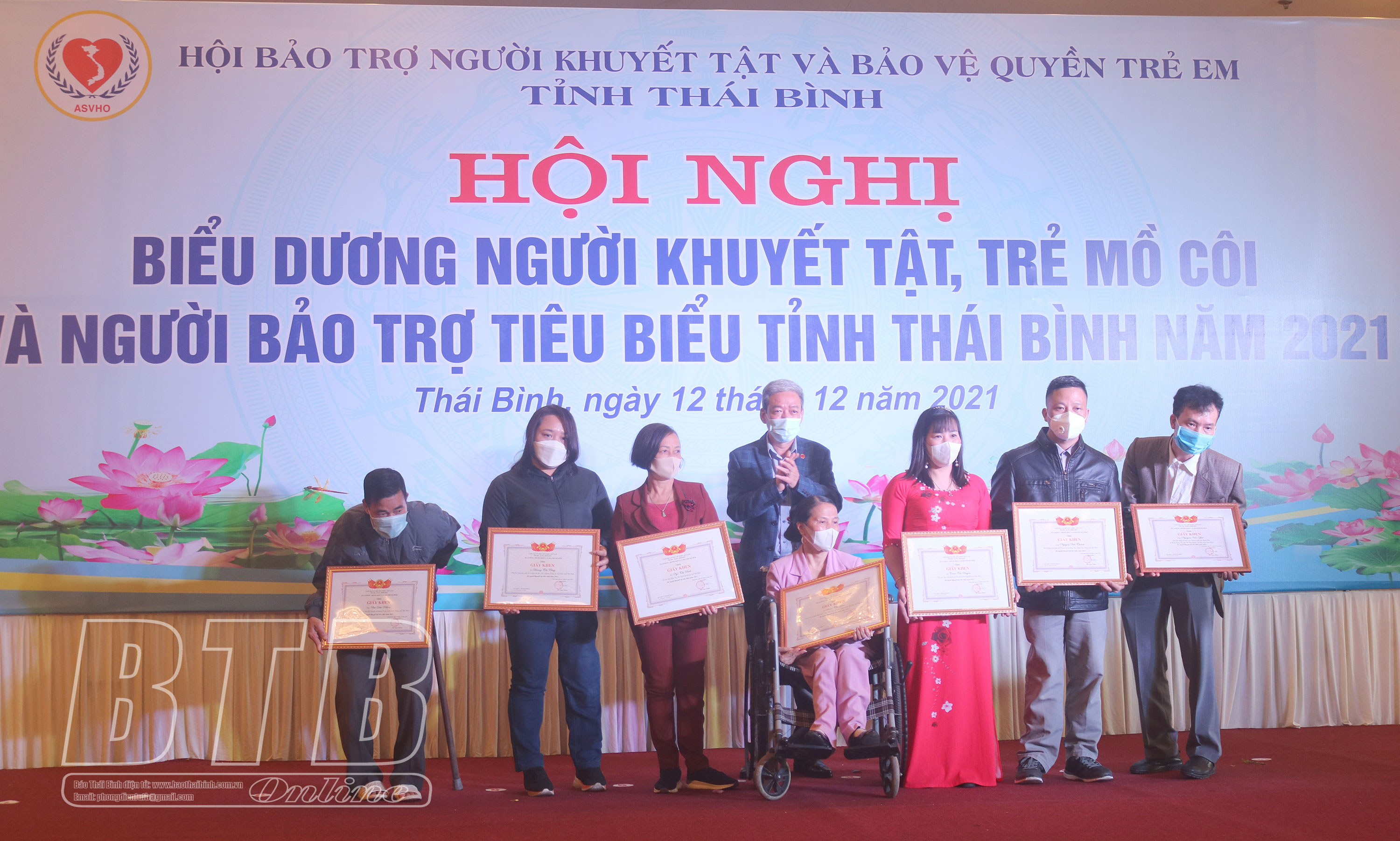 Tại hội nghị, Trung ương Hội Bảo trợ Người khuyết tật và Trẻ mồ côi Việt Nam tặng bằng khen cho 13 NBT có thành tích xuất sắc trong hoạt động bảo trợ NKT, TMC tỉnh Thái Bình năm 2021; Sở Lao động, Thương binh và Xã hội tặng giấy khen kèm theo 200.000 đồng/cá nhân cho 8 NKT tiêu biểu có thành tích trong hoạt động sản xuất, kinh doanh và các hoạt động khác năm 2021; Hội Khuyến học tỉnh tặng giấy khen kèm theo 300.000 đồng/cá nhân cho 9 học sinh khuyết tật, mồ côi vượt khó vươn lên trong học tập.