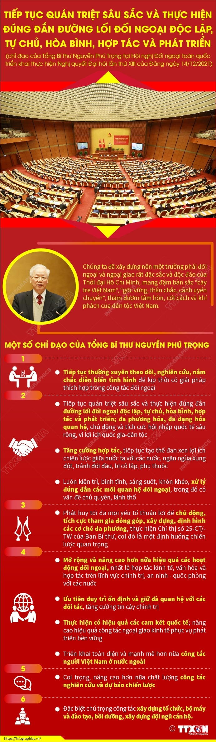 Hội nghị Đối ngoại toàn quốc triển khai thực hiện Nghị quyết Đại hội lần thứ XIII của Đảng diễn ra sáng 14/12/2021. Đây là hội nghị toàn quốc đầu tiên do Bộ Chính trị, Ban Bí thư trực tiếp chỉ đạo tổ chức để bàn về công tác đối ngoại của Đảng, ngoại giao Nhà nước, đối ngoại nhân dân và của cả hệ thống chính trị. Hội nghị nhằm triển khai thực hiện Nghị quyết Đại hội XIII của Đảng, góp phần chủ động quán triệt sâu sắc Nghị quyết Đại hội XIII của Đảng, nhất là chủ trương, đường lối, định hướng về đối ngoại với toàn Đảng, toàn quân và toàn dân. Hội nghị đánh một dấu mốc mới và tạo nên bước chuyển biến mới, mạnh mẽ hơn nữa, hiệu quả cao hơn nữa cho công tác đối ngoại, nhằm góp phần thực hiện thắng lợi đường lối đối ngoại của Đại hội đại biểu toàn quốc lần thứ XIII của Đảng.