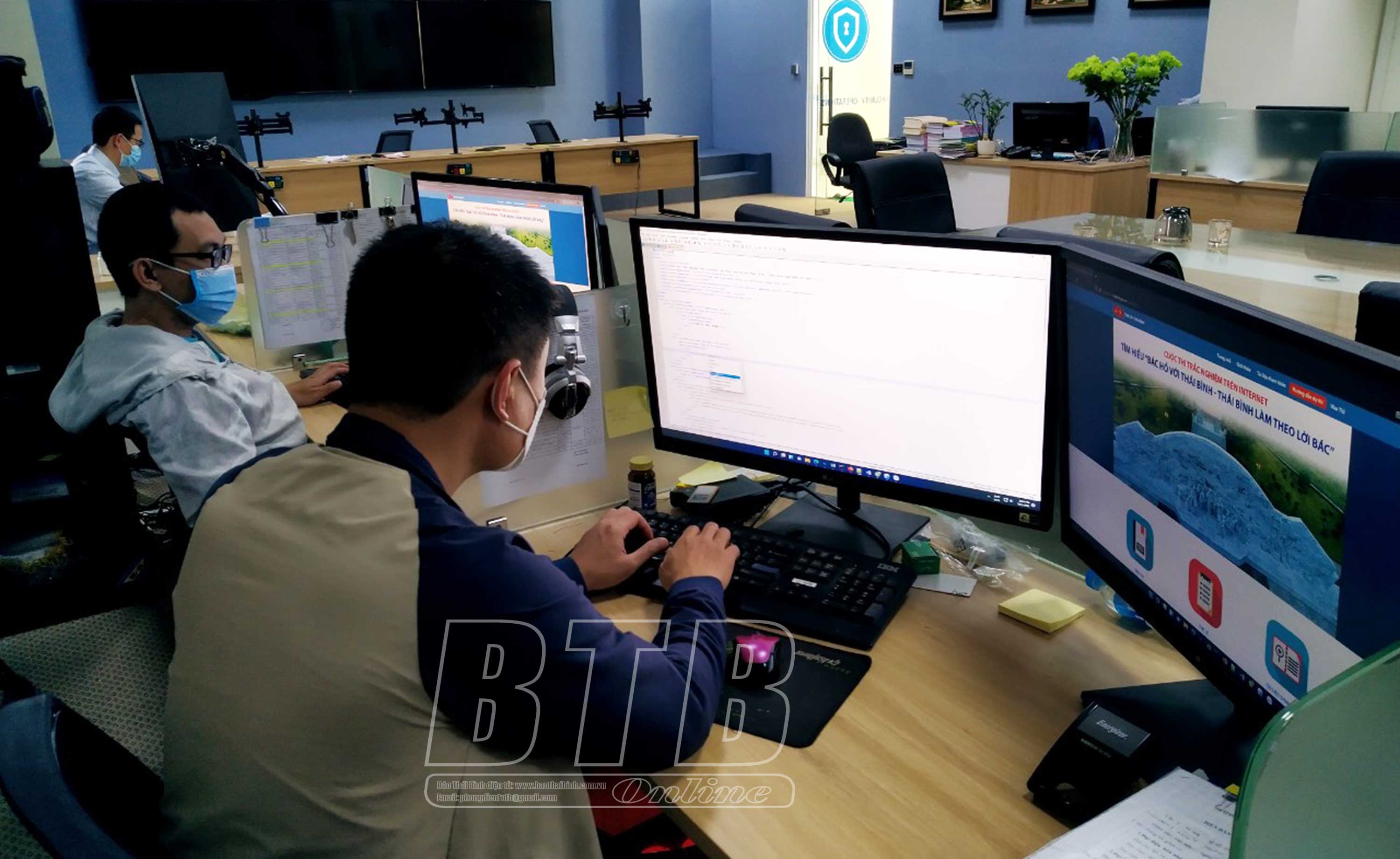 Nhân viên Trung tâm Công nghệ thông tin và truyền thông, Sở Thông tin và Truyền thông theo dõi, bảo đảm kỹ thuật và chất lượng đường truyền cho cuộc thi.