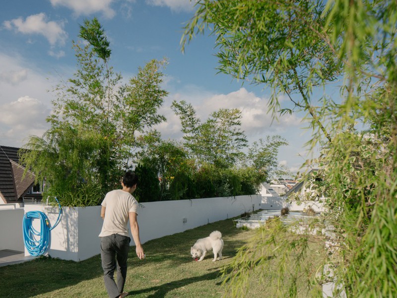 Một điểm đặc biệt khác của căn nhà chính là vườn cây xanh trên sân thượng. Loại cây chính được trồng ở đây là trúc, nhằm tạo sự riêng tư với hàng xóm cũng như tạo bóng râm. Mặt sân được đắp đất và trồng cỏ hoàn toàn.