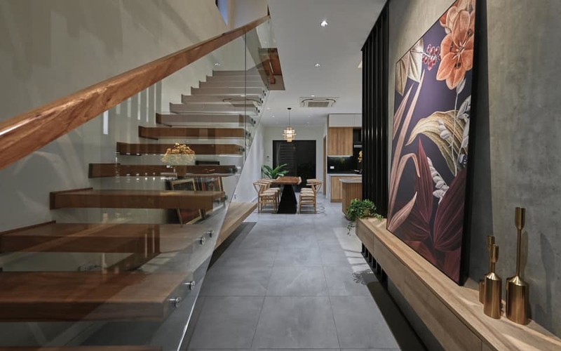 Ngay cửa chính là cầu thang bay với lan can kính tạo độ thoáng cho ngôi nhà.