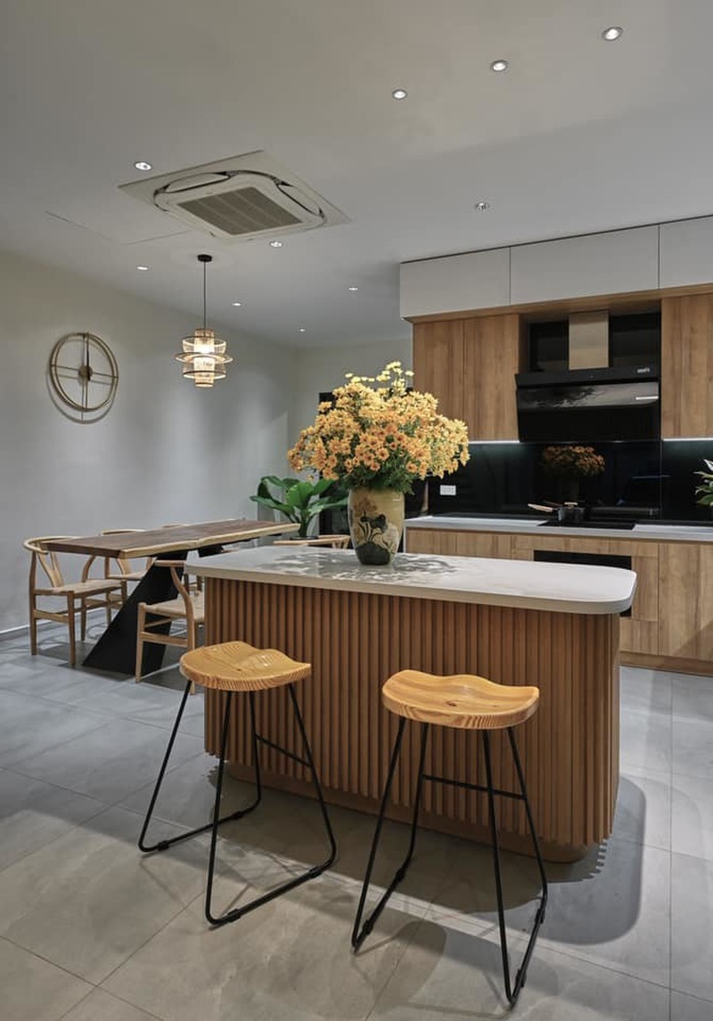 Phòng khách thông với bếp tạo không gian mở mà vẫn ấm cúng. Chị Phạm Đào thích nhất góc quầy bar này, cắm bình hoa nào lên cũng thật ưng ý. Sàn lát gạch men sần.