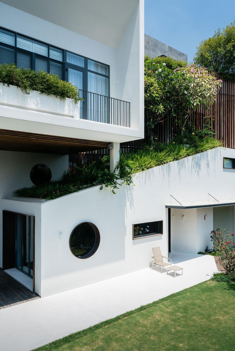 Mỗi “tầng” ruộng bậc thang của ngôi nhà sẽ là một không gian chức năng nhưng khi nhìn tổng thể những không gian ấy vẫn được liên kết chặt chẽ với nhau. Mỗi vị trí của đường cắt xéo ở mặt tiền trở thành một khu vườn dốc trồng cây xanh. Trong đó, những cây thân thảo mềm nằm ở tầng thấp nhất, cây cao lớn, thân gỗ nằm ở tầng cao hơn.