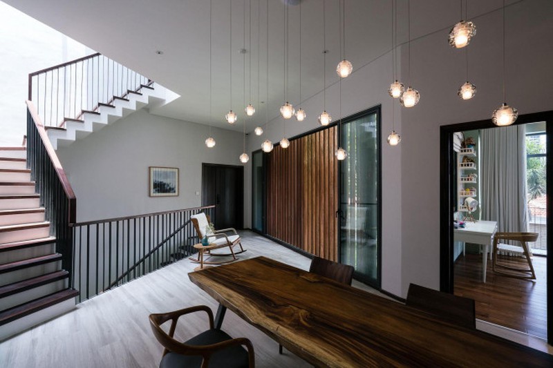 Do gia chủ có nhu cầu dùng thang máy nên KTS đặt thang máy ở phía góc nhà và sử dụng ốp gỗ để bao che tạo cảm giác giống như một chiếc cây. Do đó, nếu thoạt nhìn qua khu vực thang máy kết hợp với chiếc đèn chùm (giống như một tổ chim) khiến chúng ta liên tưởng đến một khung cảnh đặc trưng của thiên nhiên.