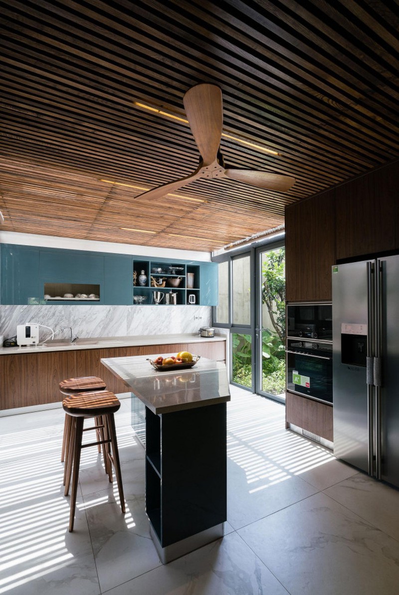 Khu vực ăn uống và bếp đều có tầm nhìn thoáng ra vườn. Vật liệu trong bếp dễ lau chùi và bảo dưỡng. Bộ bàn ăn phù hợp với việc sử dụng gỗ cho trần và sàn.