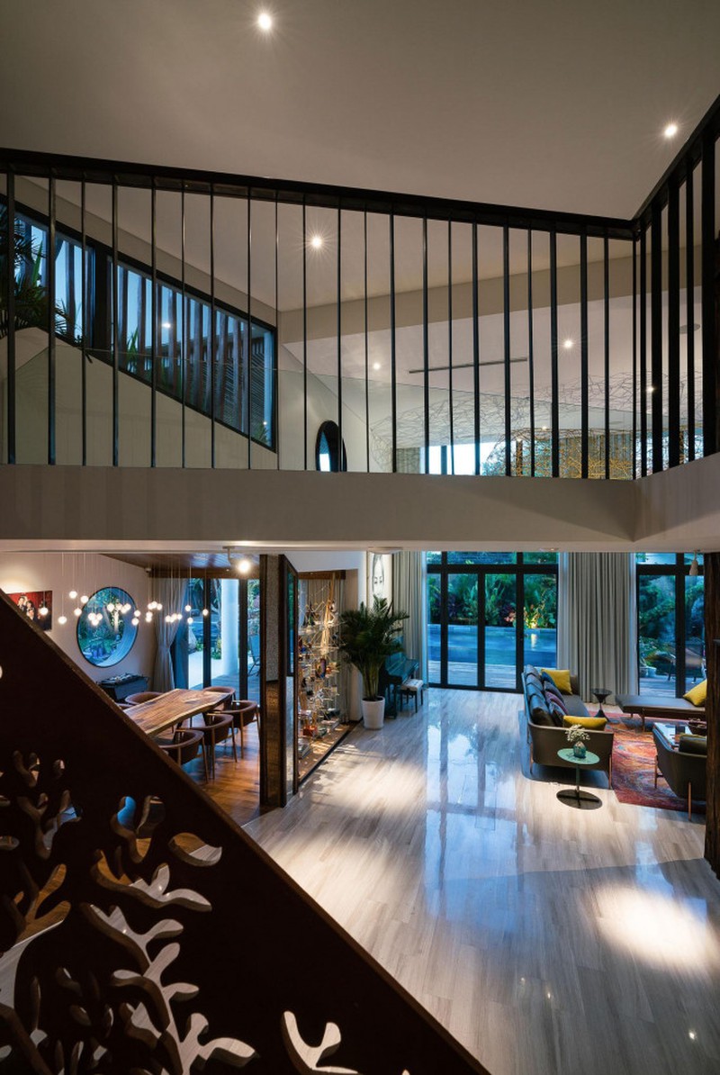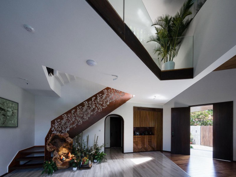 Cầu thang di chuyển lên các tầng trên được gia công rất tỉ mỉ. Phần tay vịn cầu thang sử dụng một tấm thép lớn màu nâu được cắt CNC tạo ra nhiều hoa văn tinh xảo.