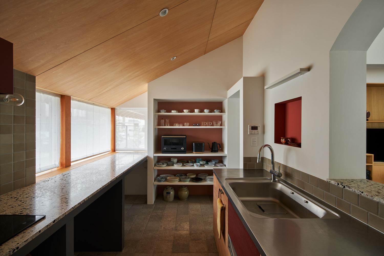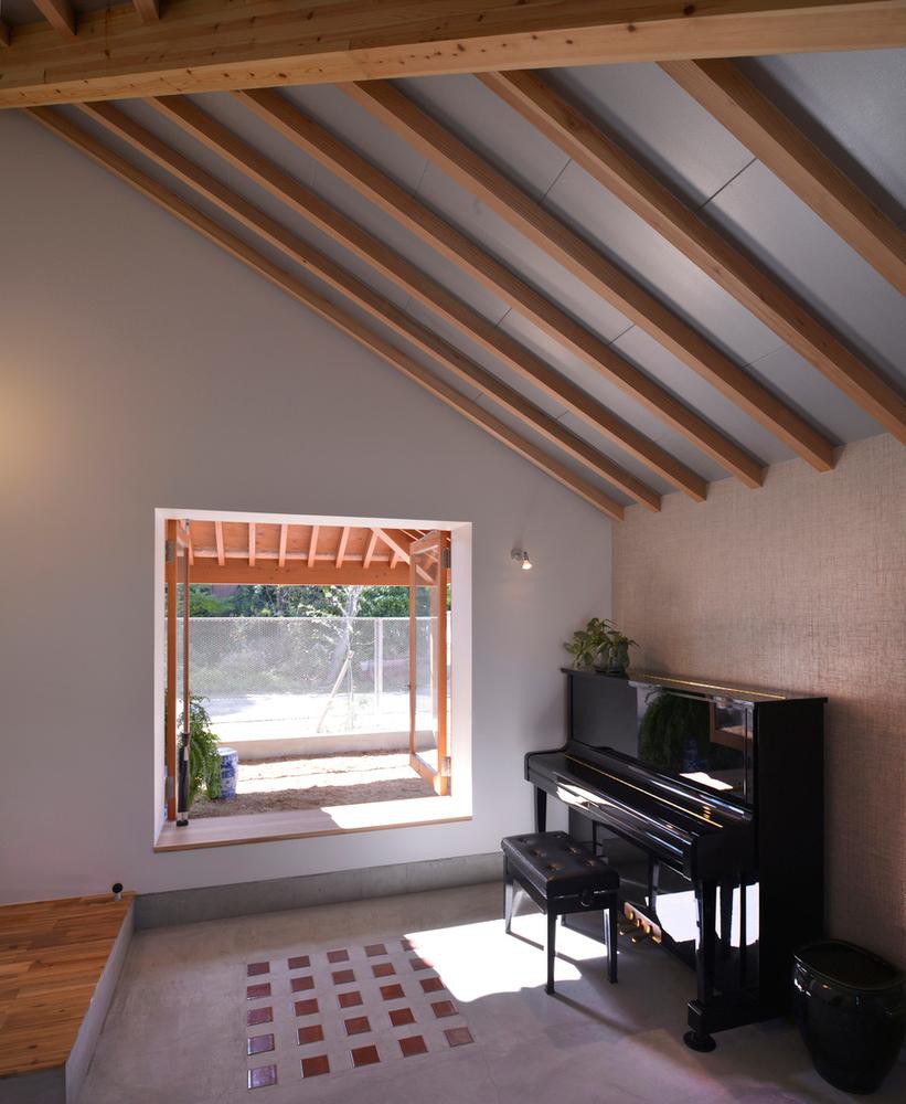 Phần mái dài của ngôi nhà tận dụng mặt tiền rộng của khuôn viên có độ dốc lớn giúp tuyết không đọng lại trên mái, mặt khác mái được làm bản lề để không gây cảm giác ngột ngạt cho xung quanh. Mái và các bức tường của khối tầng hai được làm bằng tôn mạ kẽm với bốn chiều rộng khác nhau.