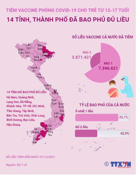 Các tỉnh, thành phố đã cơ bản bao phủ đủ liều vaccine COVID-19 cho nhóm tuổi 12-17 là: Hà Nam, Quảng Ninh, Lạng Sơn, Đà Nẵng, Khánh Hòa, TP Hồ Chí Minh, Tiền Giang, Tây Ninh, Bến Tre, Trà Vinh, Vĩnh Long, Bình Dương, Bạc Liêu và Hậu Giang.
