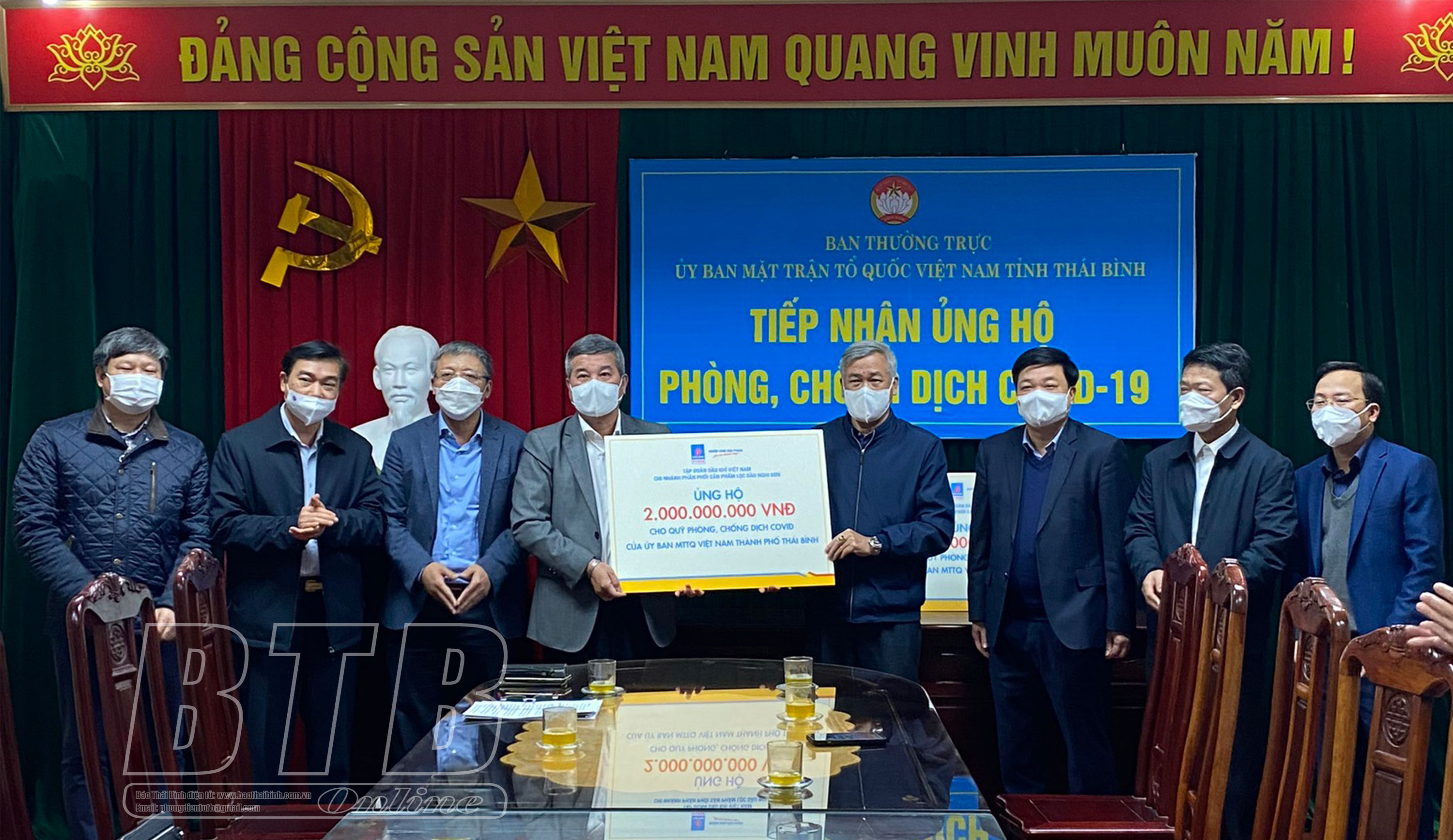 Tại buổi tiếp nhận, đồng chí Đỗ Chí Thanh, Phó Tổng giám đốc Tập đoàn Dầu khí Việt Nam, đại diện Tập đoàn Dầu khí Việt Nam, Chi nhánh phân phối sản phẩm lọc dầu Nghi Sơn đã trao 3 tỷ đồng ủng hộ công tác phòng, chống dịch Covid-19 của tỉnh; trao 2 tỷ đồng ủng hộ công tác phòng, chống dịch Covid-19 của thành phố Thái Bình. Đồng chí Nguyễn Văn Giang, Ủy viên Ban Thường vụ, Trưởng ban Dân vận Tỉnh ủy, Chủ tịch Ủy ban MTTQ tỉnh cảm ơn sự ủng hộ của Tập đoàn Dầu khí Việt Nam, Chi nhánh phân phối sản phẩm lọc dầu Nghi Sơn đối với công tác phòng, chống dịch Covid-19 của Thái Bình, đồng thời khẳng định nguồn lực hỗ trợ sẽ được Ủy ban MTTQ tỉnh quản lý, sử dụng đúng mục đích, phát huy hiệu quả, góp phần thực hiện tốt công tác phòng, chống dịch Covid-19 trên địa bàn tỉnh.