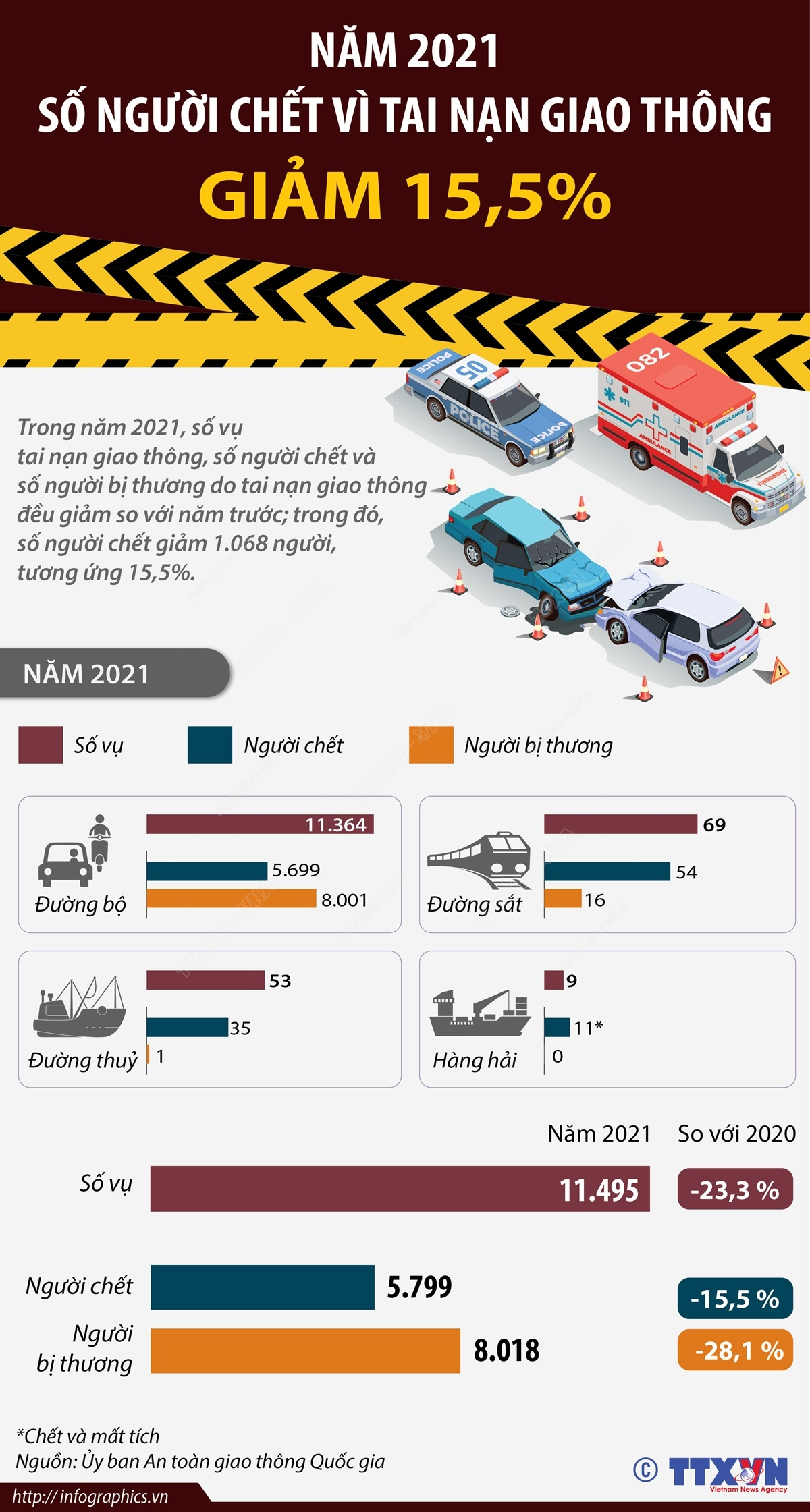 Trong năm 2021, số vụ tai nạn giao thông, số người chết và số người bị thương do tai nạn giao thông đều giảm so với năm trước; trong đó, số người chết giảm 1.068 người, tương ứng 15,5%.