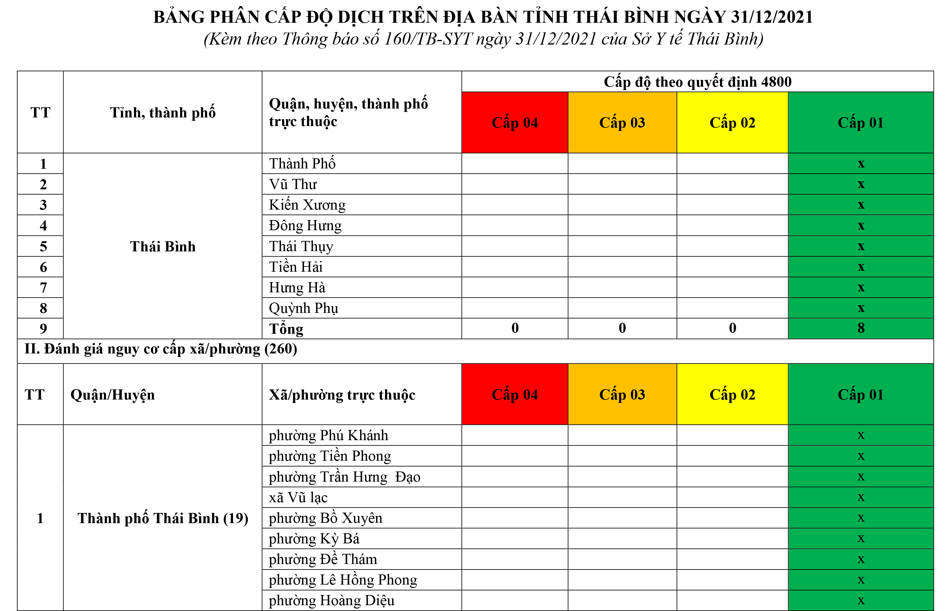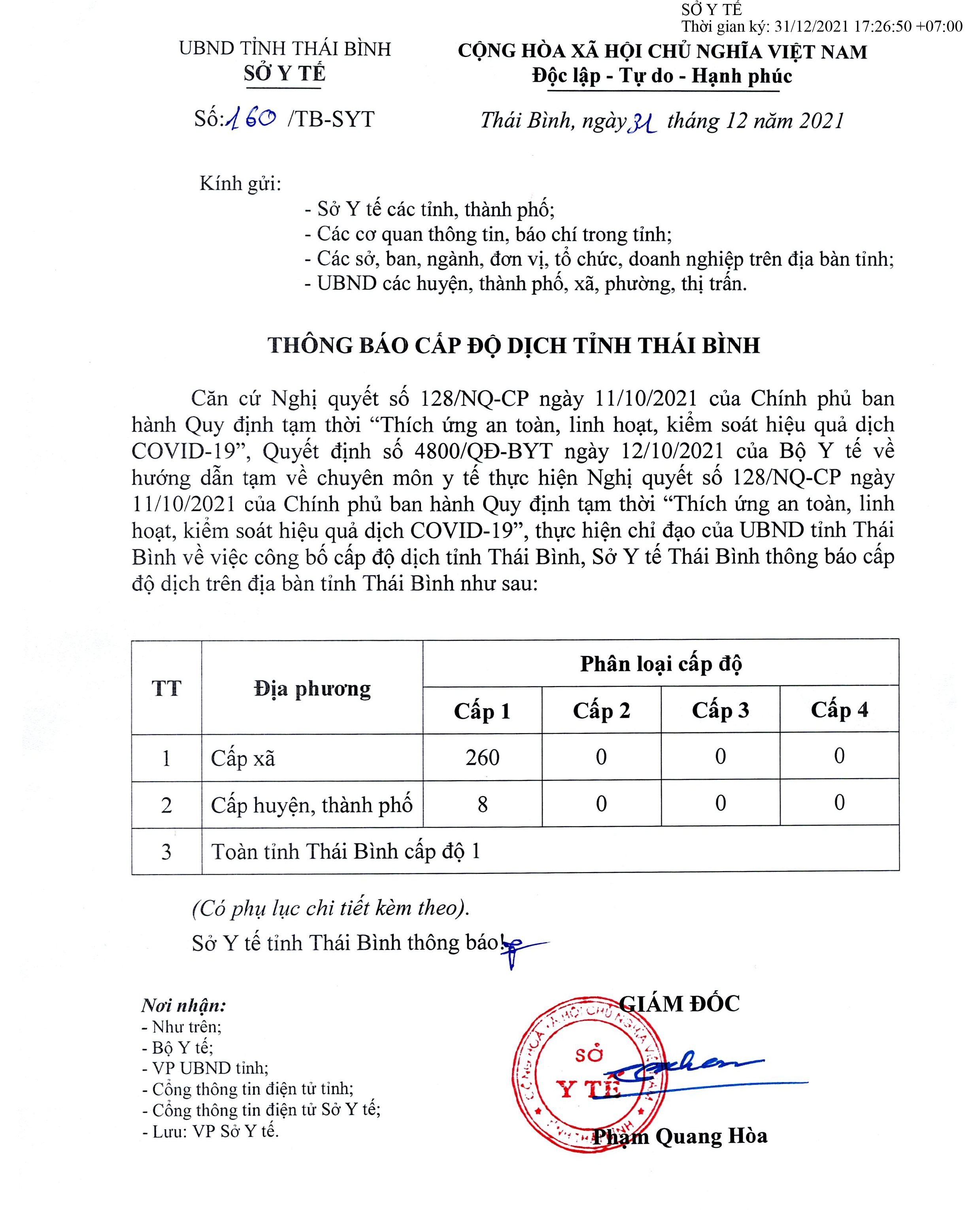 Thông báo cấp độ dịch tỉnh Thái Bình