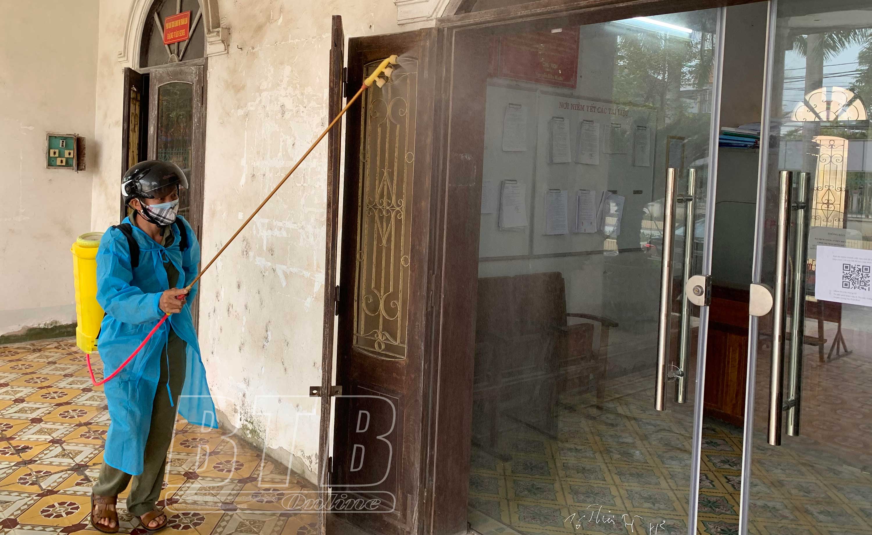 Thị trấn Hưng Hà tổ chức phun khử khuẩn tại các trụ sở Đảng ủy, HĐND, UBND thị trấn.