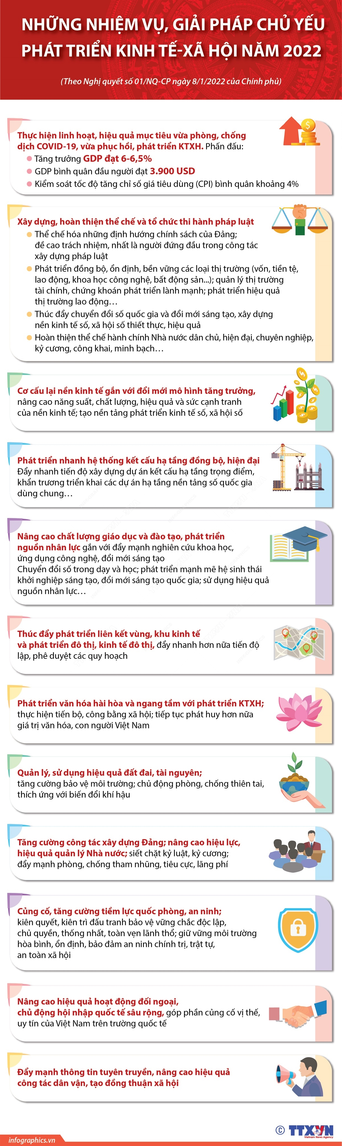 Chính phủ vừa ban hành Nghị quyết 01/NQ-CP ngày 8/1/2022 về nhiệm vụ, giải pháp chủ yếu thực hiện Kế hoạch phát triển kinh tế-xã hội và Dự toán ngân sách nhà nước năm 2022. Theo đó, chủ đề điều hành năm 2022 là “Đoàn kết kỷ cương, chủ động thích ứng, an toàn hiệu quả, phục hồi phát triển”. Với 12 nhiệm vụ, giải pháp chủ yếu, Chính phủ phấn đấu tăng trưởng GDP năm 2022 đạt 6-6,5%, GDP bình quân đầu người đạt 3.900 USD, phát triển văn hóa hài hòa và ngang tầm với phát triển KTXH, nâng cao năng lực hệ thống y tế, nhất là y tế dự phòng và y tế cơ sở...