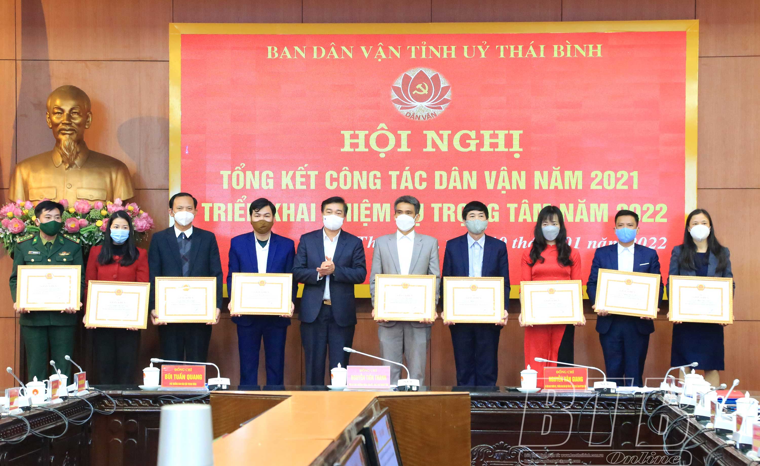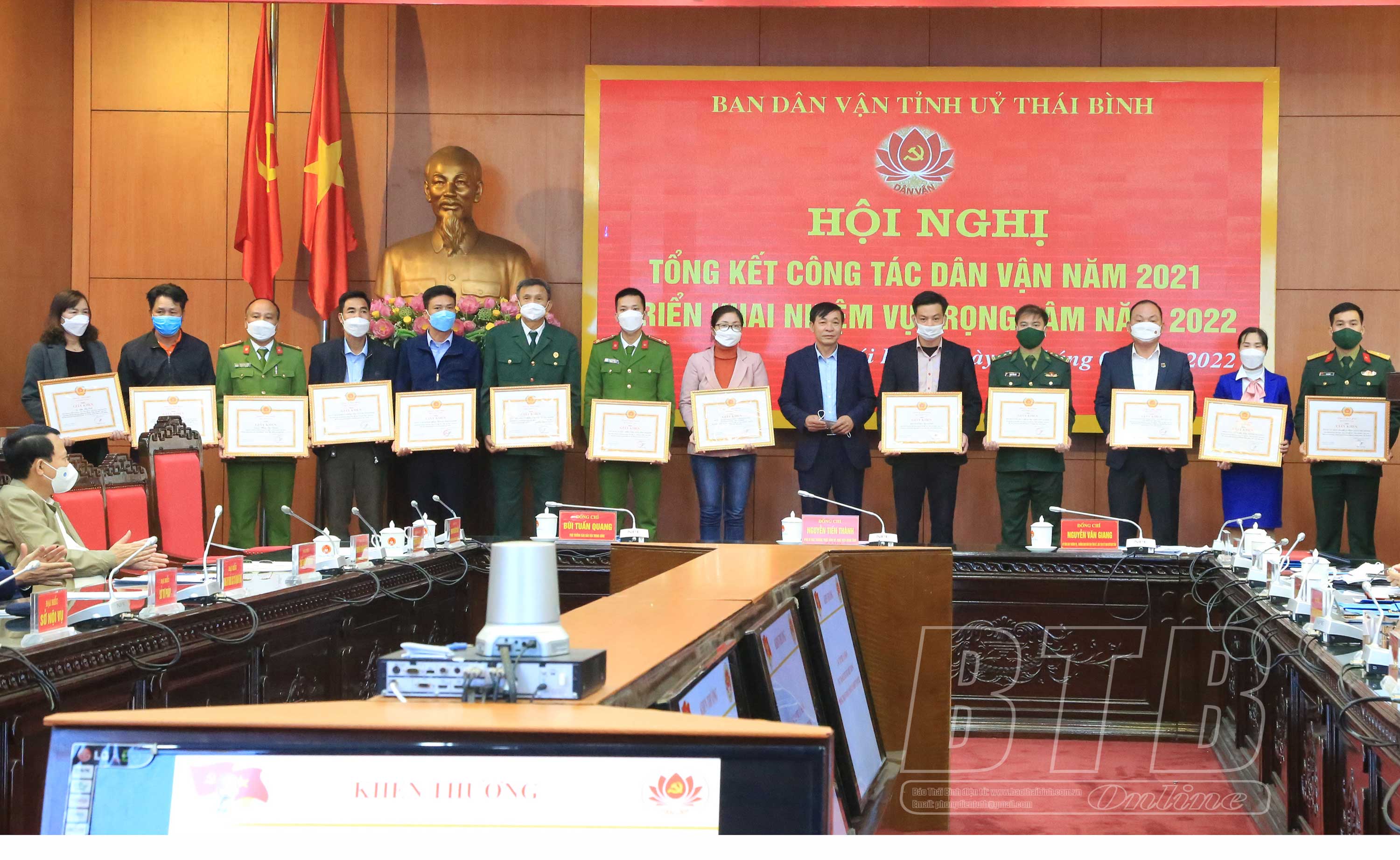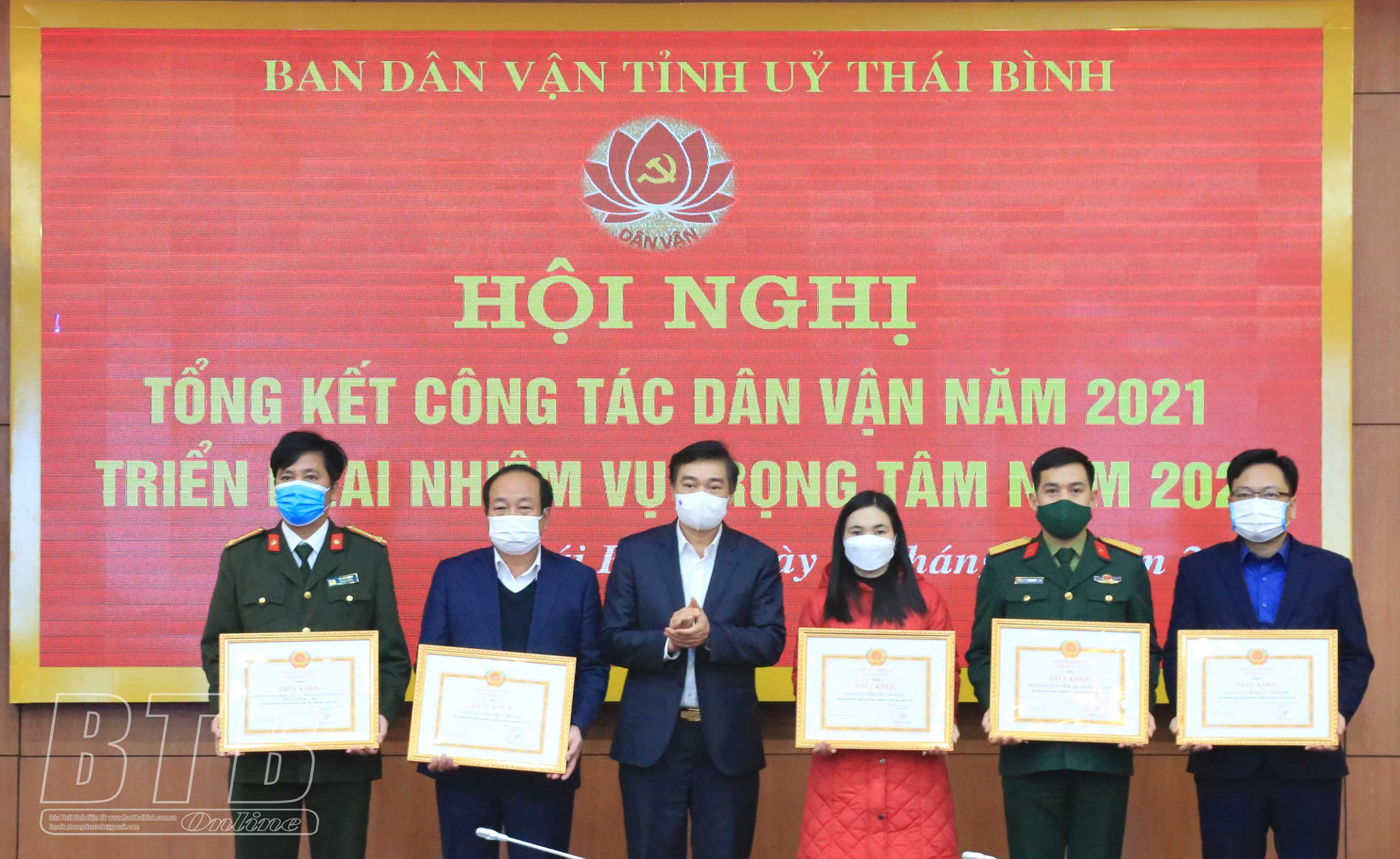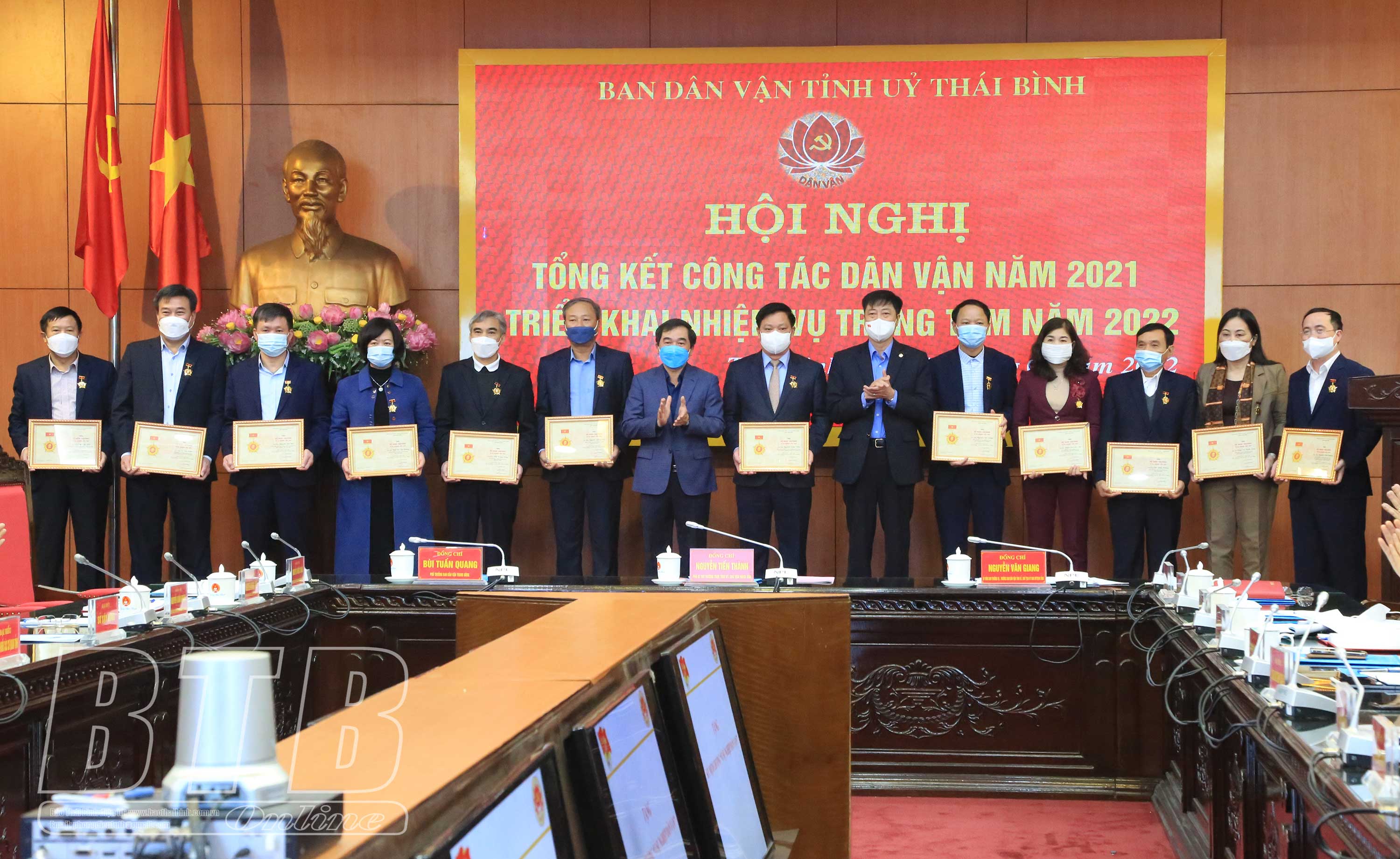 Năm 2021, tỉnh Thái Bình có 40 đồng chí được Ban Dân vận Trung ương tặng kỷ niệm chương “Vì sự nghiệp dân vận”. Tại hội nghị, đồng chí Phó Trưởng ban Dân vận Trung ương và đồng chí Phó Bí thư thường trực Tỉnh ủy, Chủ tịch HĐND tỉnh đã trao kỷ niệm chương “Vì sự nghiệp dân vận” cho đồng chí Nguyễn Khắc Thận, Phó Bí thư Tỉnh ủy, Chủ tịch UBND tỉnh và 16 đồng chí là cán bộ lãnh đạo chủ chốt các sở, ngành, đơn vị của tỉnh. Nhân dịp này, Ban Dân vận Tỉnh ủy đã khen thưởng 27 tập thể, cá nhân có thành tích xuất sắc trong công tác dân vận và phong trào thi đua “dân vận khéo” năm 2021.