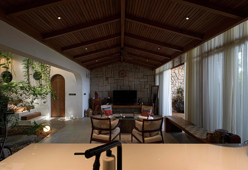 Phòng khách không sử dụng sofa như thông thường mà dùng bộ bàn ghế đan mây mắt cáo, kèm thêm ghế băng dài. Bức tường bằng đá to bản, cắt gọt thô nhám ghép lại với nhau để tạo nét mộc. Không gian này sử dụng cửa kính lớn thay tường gạch, mang thiên nhiên lại gần gia chủ. Đồng thời, một bên cũng có giếng trời và vườn cây mini, tạo khoảng xanh mát cho nhà.
