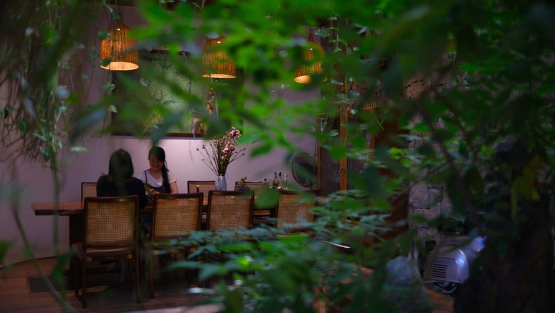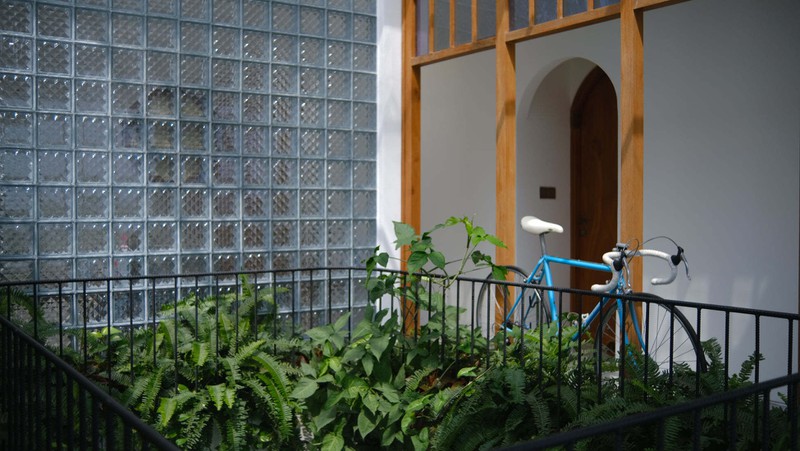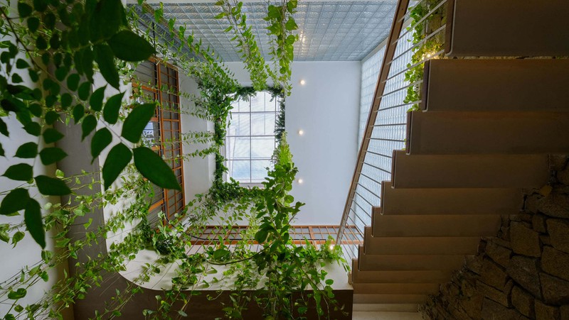 Giàn dây leo rủ xuống từ khu vực giếng trời tạo ra khung cảnh tuyệt đẹp như trong truyện cổ tích.