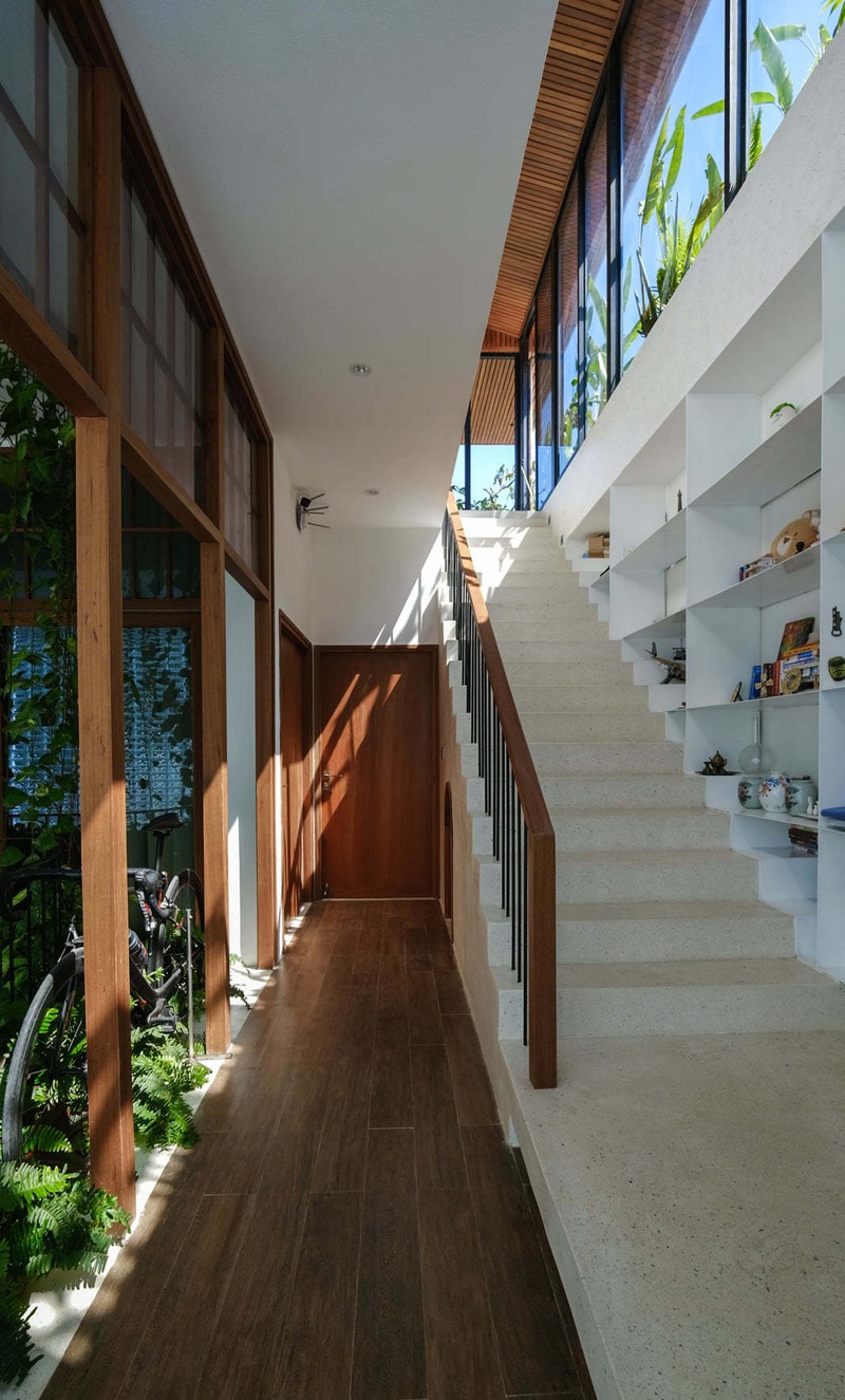 Cầu thang và sảnh dẫn lên các phòng là không gian mở, dễ kết nối mọi người. Với thiết kế đối lưu, không khí và gió luôn được tràn vào nhà dễ dàng, mang đến cho gia chủ sự thư thái, tận hưởng.