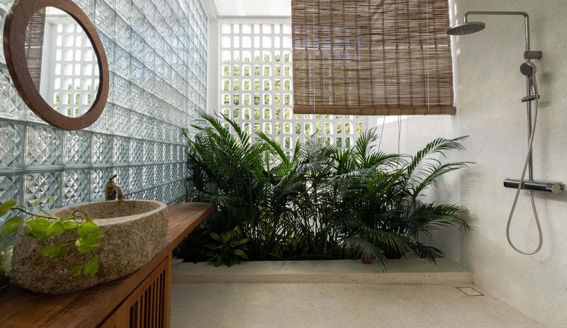 Cuộc sống hòa hợp với thiên nhiên là ý tưởng xuyên suốt của công trình nên mọi không gian đều được bố trí mảng xanh. Phòng tắm nằm sát giếng trời, trải sỏi gây ấn tượng mạnh với bất cứ ai khi bước vào tham quan công trình.
