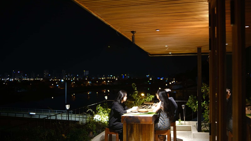 Nơi ăn uống trên tầng, ngắm cảnh vật thay đổi một ngày trên sông, từ bình minh đến khi hoàng hôn và ánh đèn ở đô thị phía xa xa.