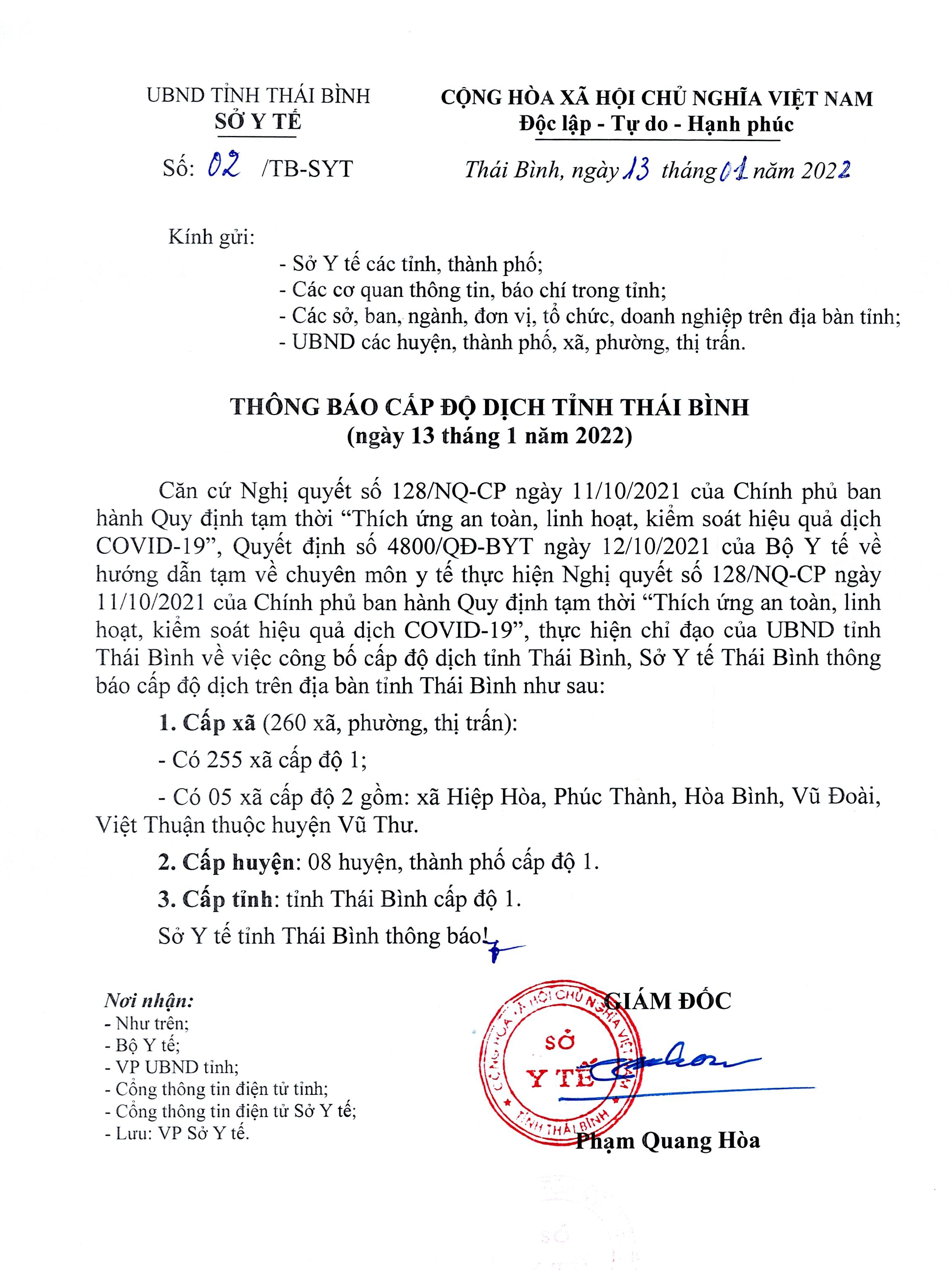 Thông báo cấp độ dịch tỉnh Thái Bình