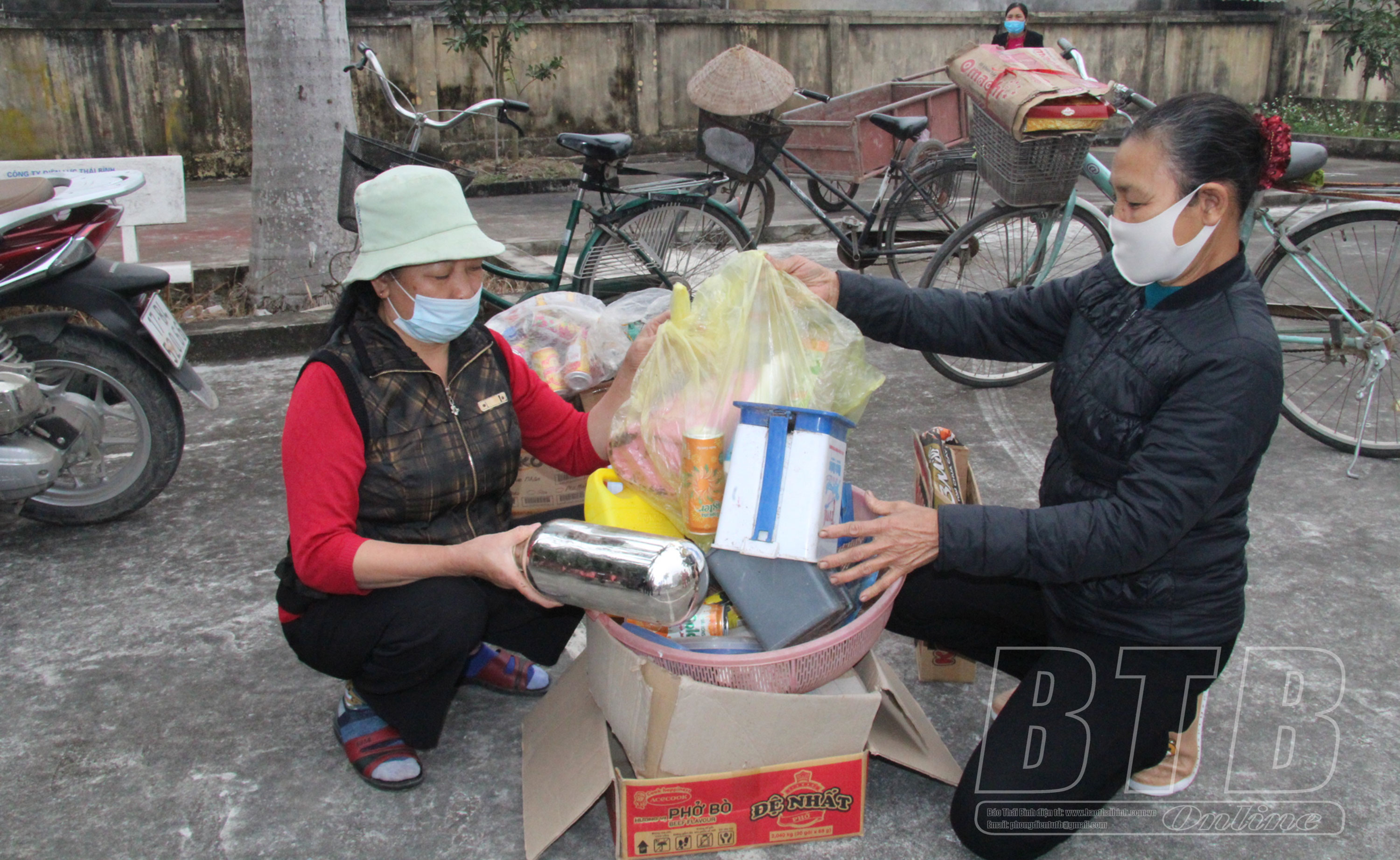 Chị em phụ nữ xã Minh Khai (Hưng Hà) phân loại rác thải.