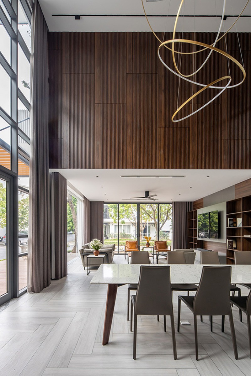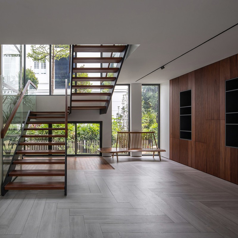 Gỗ ốp dọc hai bên thông tầng cũng được thiết kế như những đốt trên thân tre.
