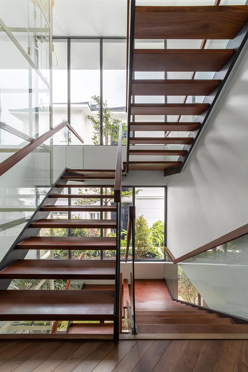 Cầu thang dư thừa ánh sáng tự nhiên nhờ các cửa sổ kính lớn thiết kế chạy dọc ngôi nhà.
