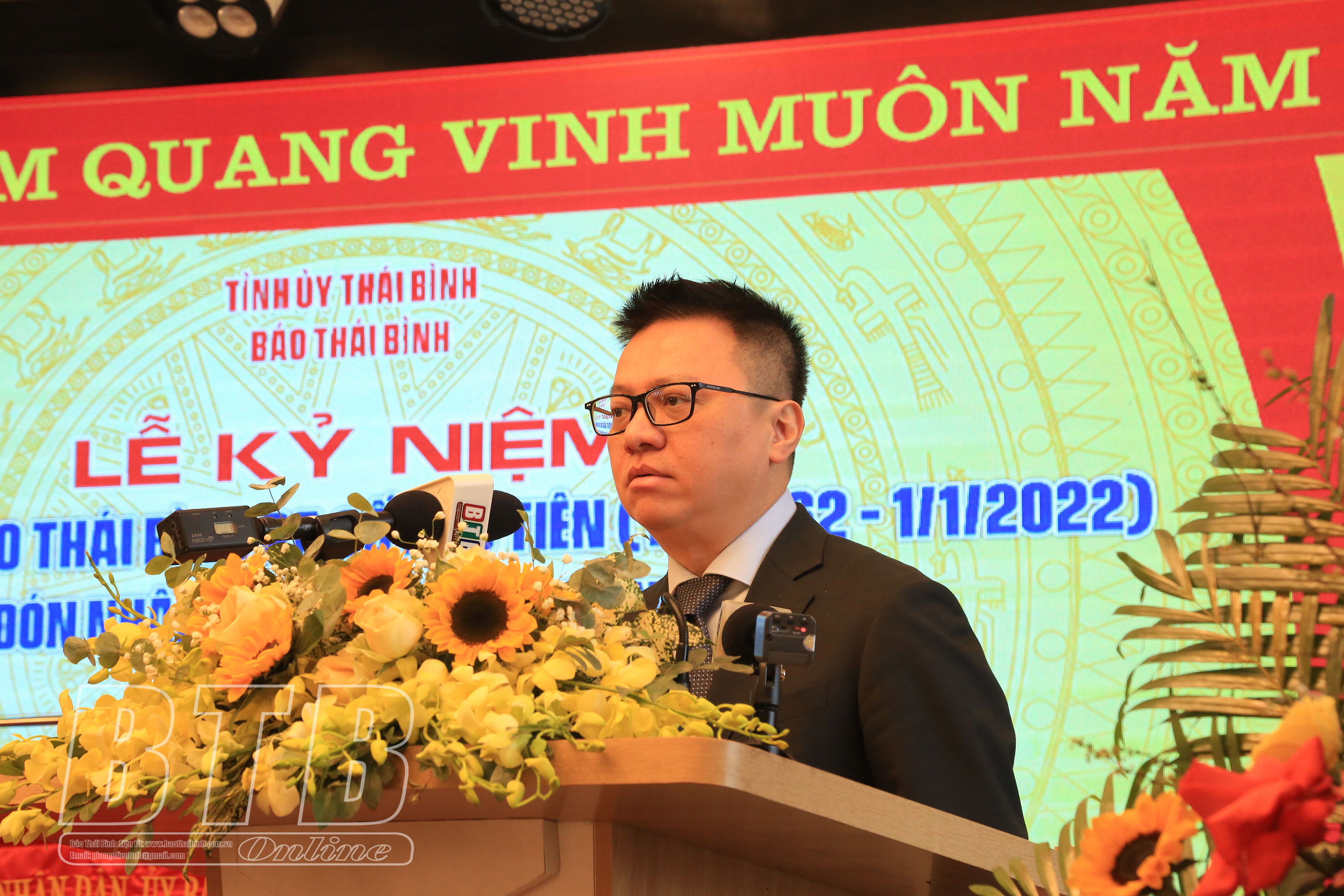 Phát biểu tại buổi lễ, đồng chí Lê Quốc Minh, Ủy viên Ban Chấp hành Trung ương Đảng, Tổng Biên tập Báo Nhân dân, Phó Trưởng ban Tuyên giáo Trung ương, Chủ tịch Hội Nhà báo Việt Nam đánh giá cao những thành tựu đạt được của Báo Thái Bình qua các thời kỳ, đồng chí cũng bày tỏ sự cảm nhận sâu sắc về niềm tin tưởng của các thế hệ cán bộ lãnh đạo, nhân dân đối với Báo Thái Bình. Đồng chí nhấn mạnh trong sự phát triển như vũ bão của khoa học công nghệ, truyền thông đại chúng hiện nay, mỗi cơ quan báo Đảng trong đó có Báo Thái Bình cần phải đổi mới hơn nữa mới đáp ứng được yêu cầu thông tin trong giai đoạn mới. Đại hội Hội Nhà báo Việt Nam lần thứ XI vừa tổ chức thành công với phương châm “Đoàn kết – Kỷ cương – Đổi mới – Sáng tạo – Phát triển”. Để đổi mới, sáng tạo và phát triển, yêu cầu mỗi cơ quan báo chí phải xây dựng đội ngũ những người làm báo thực sự chuyên nghiệp, chuyên nghiệp trong từng bài viết, từng bức ảnh… Các cơ quan báo Đảng ngoài thực hiện tuyên truyền trên các kênh báo chí truyền thống của mình phải tận dụng các nền tảng truyền thông khác để đưa thông tin nhiều nhất, nhanh nhất, chính xác nhất đến mọi tầng lớp nhân dân. Mỗi người làm báo phải tự trau dồi, tự bồi dưỡng, rèn luyện để có thể đáp ứng với yêu cầu 4 trong 1 của người làm báo hiện đại. Thời gian tới, Báo Nhân dân sẽ tổ chức các hoạt động chuyên môn, nghiệp vụ để hỗ trợ các cơ quan báo Đảng hòa nhập vào tiến trình đổi mới của báo chí Việt Nam, chung sức đồng lòng, ra sức phấn đấu xây dựng nền báo chí cách mạng Việt Nam giàu tính chiến đấu, nhân văn, chuyên nghiệp, hiện đại vì sự phát triển của đất nước.