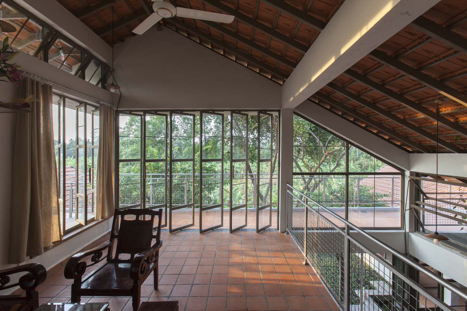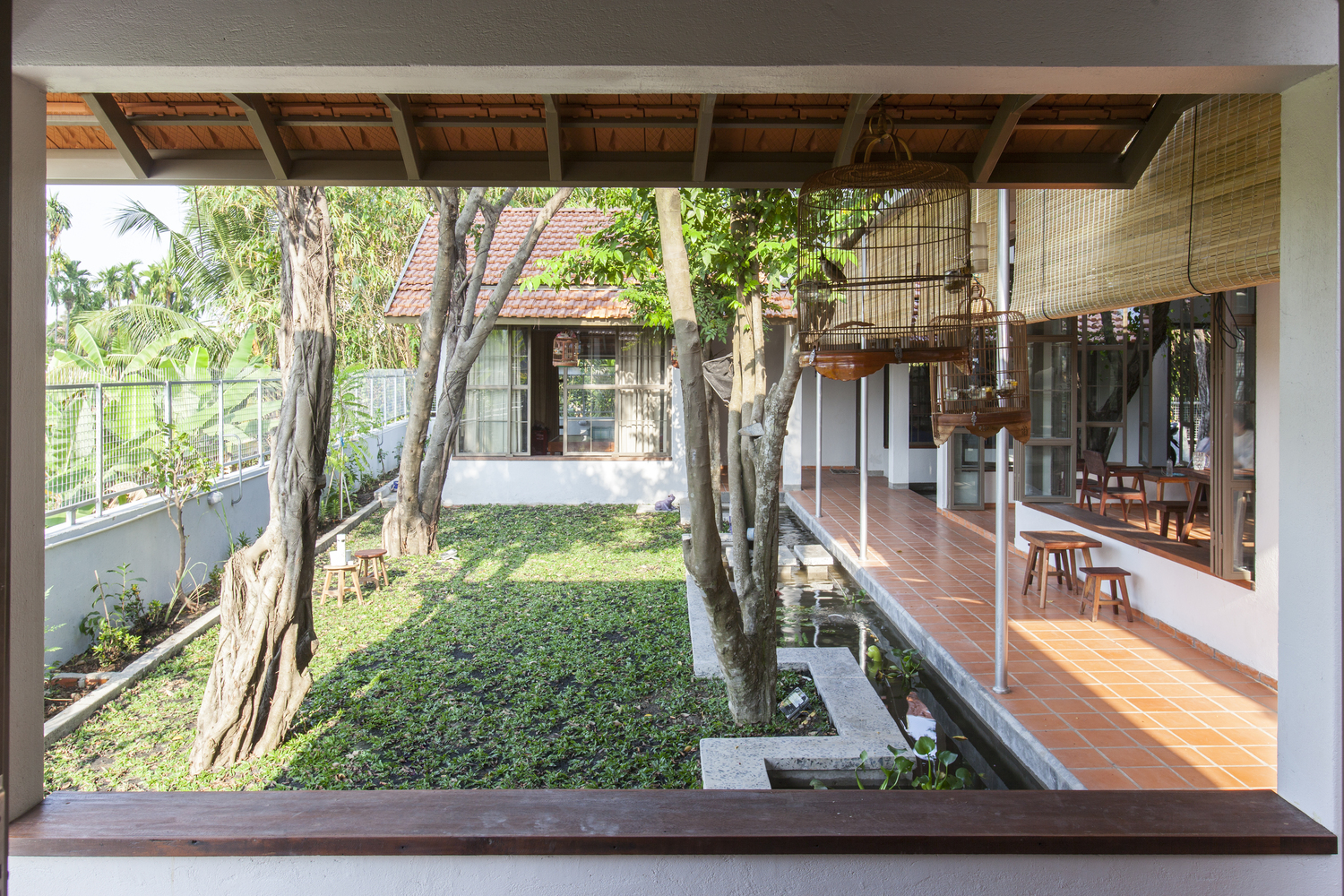 Các hoạt động trong nhà đều có góc nhìn hướng vào khoảng sân chính: nơi có hồ cá trải dài, 4 gốc cây lớn và vườn chuối thấp thoáng phía xa.