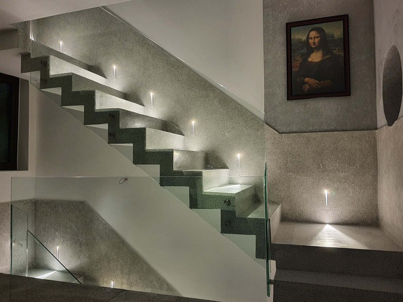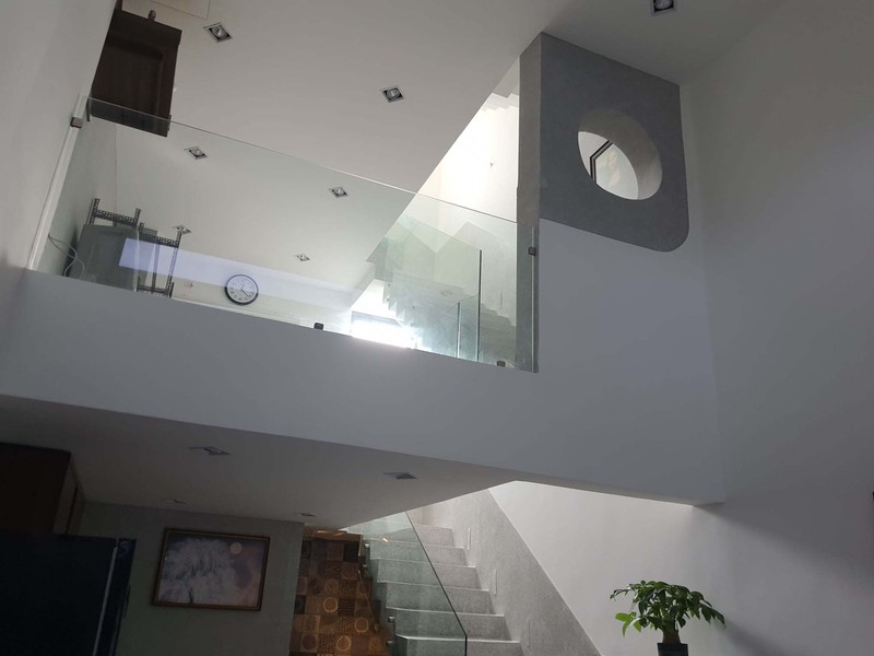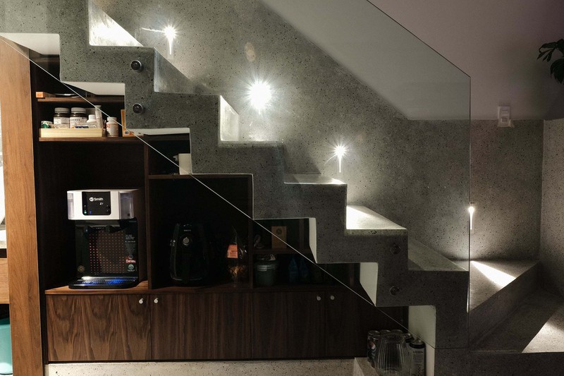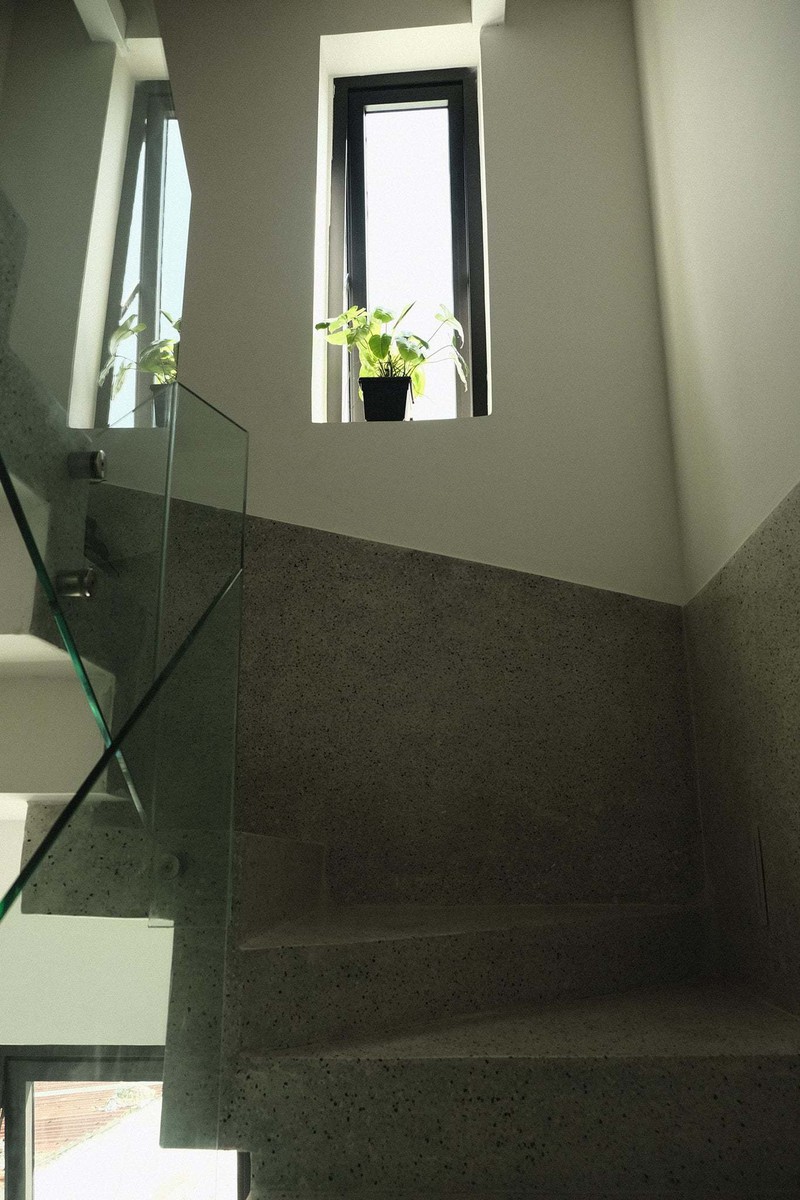 Cầu thang bê-tông mài, vách kính trong kết hợp đèn led tăng độ sang cho nhà.