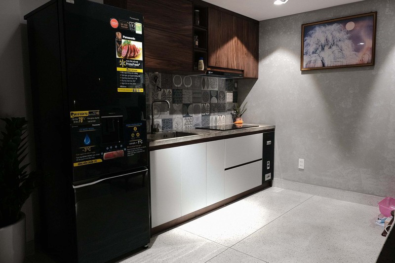 Tường bếp dùng loại gạch nhập từ Tây Ban Nha có giá 1,1 triệu/m2 và mặt bếp bằng đá mài.