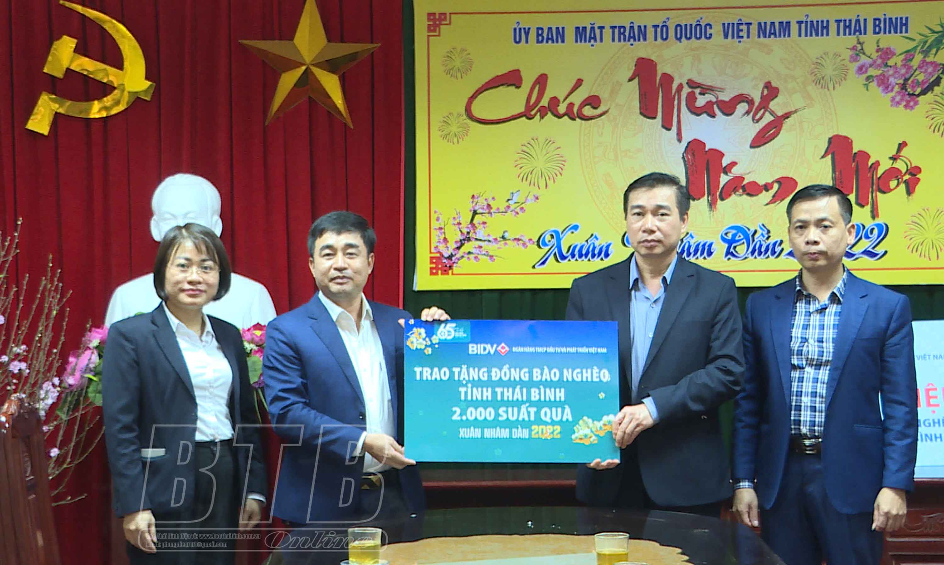 Đại diện Tập đoàn Dầu khí Quốc gia Việt Nam đã trao 500 triệu đồng; đại diện Ngân hàng Thương mại Cổ phần Đầu tư và Phát triển Việt Nam - chi nhánh Thái Bình đã trao 2.000 suất quà với tổng trị giá 1 tỷ đồng tặng cho người nghèo, người có hoàn cảnh khó khăn trên địa bàn tỉnh nhân dịp tết Nguyên đán Nhâm Dần 2022.