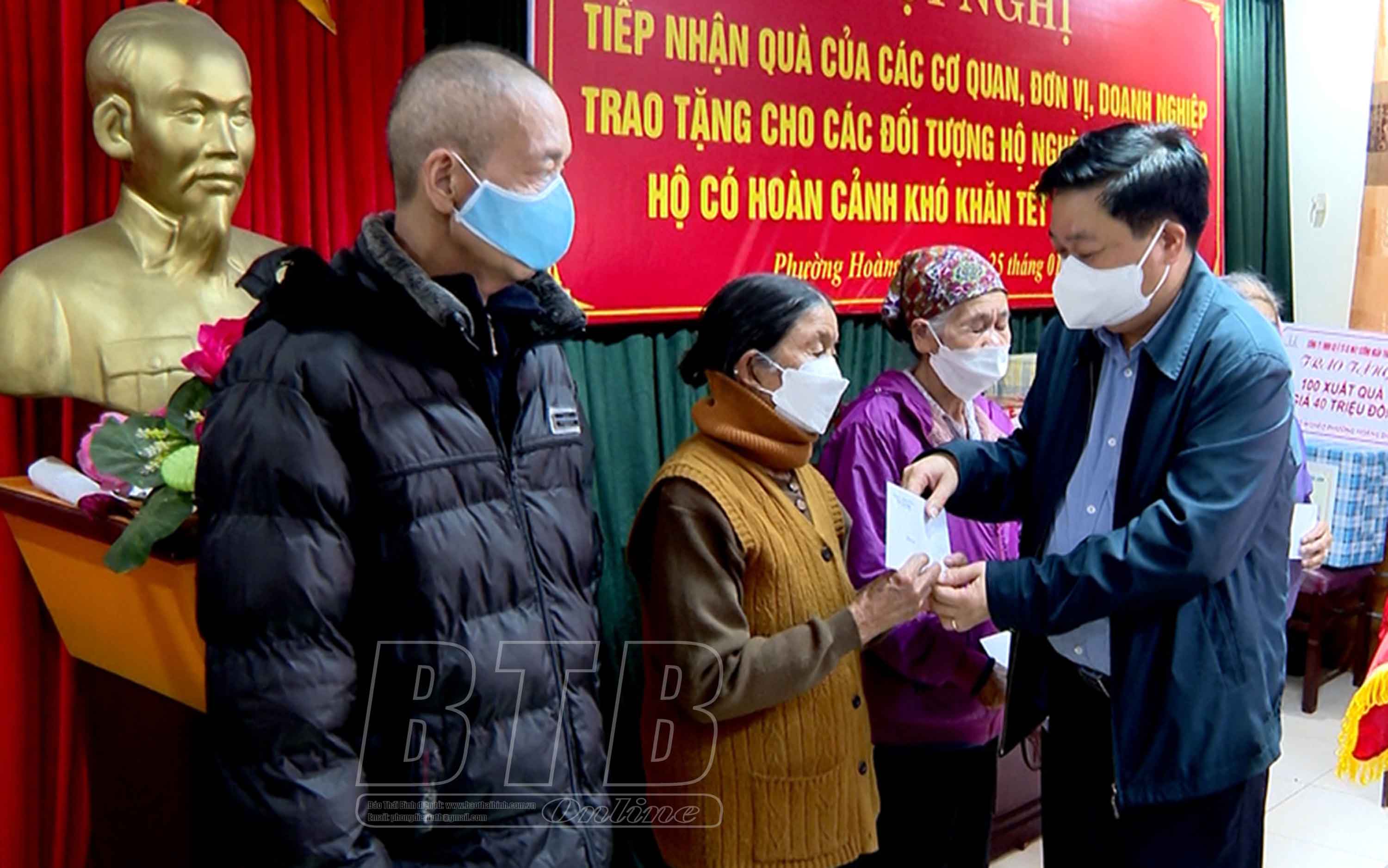 Đồng chí Nguyễn Quang Hưng, Ủy viên Ban Thường vụ Tỉnh ủy, Phó Chủ tịch thường trực UBND tỉnh trao quà tết hộ nghèo, hộ cận nghèo phường Hoàng Diệu, thành phố Thái Bình.