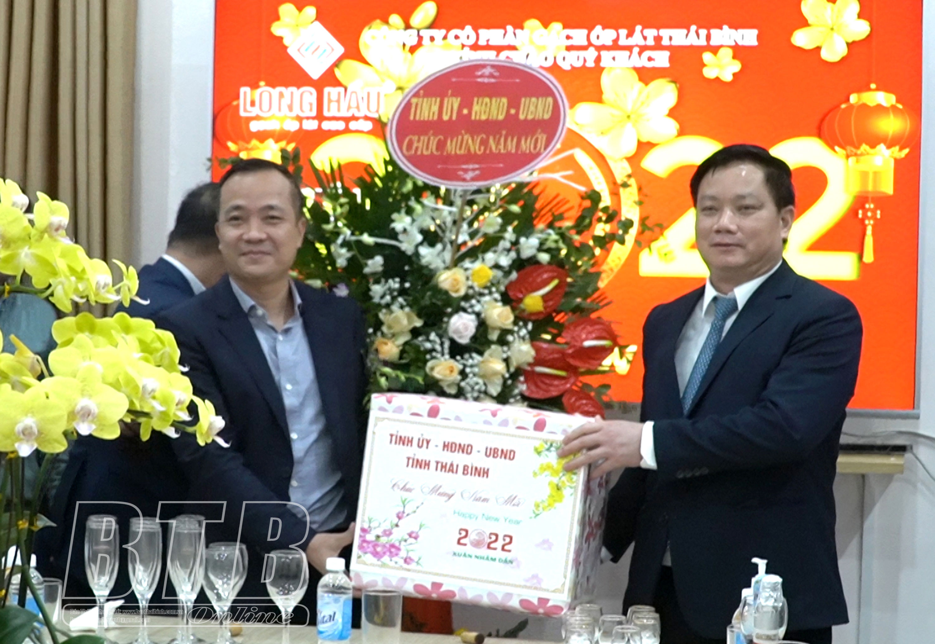 Thay mặt Tỉnh ủy, HĐND, UBND tỉnh, đồng chí Nguyễn Khắc Thận, Phó Bí thư Tỉnh ủy, Chủ tịch UBND tỉnh tặng hoa, quà chúc tết Công ty Cổ phần Gạch ốp lát Thái Bình.