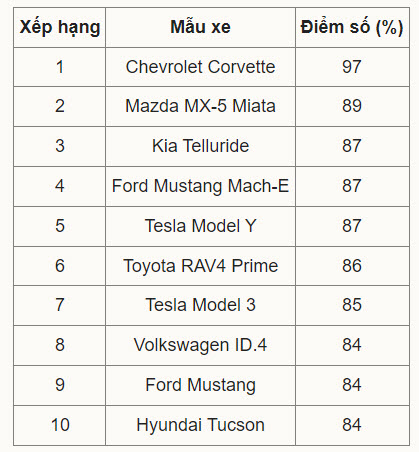 Mẫu thể thao hai cửa Chevrolet Corvette đứng đầu Top 10 với điểm số cao hơn hẳn phần còn lại, với vị trí thứ hai cũng là một chiếc thể thao hai cửa khác, Mazda MX-5 Miata. Ngoài ra, cùng phân khúc này còn có Ford Mustang, gồm cả bản động cơ đốt trong và xe điện Mach-E. Những sản phẩm này mang tới thứ mà những khách hàng chuộng xe thể thao tìm kiếm, dù có thể xếp hạng rất thấp ở độ tin cậy.