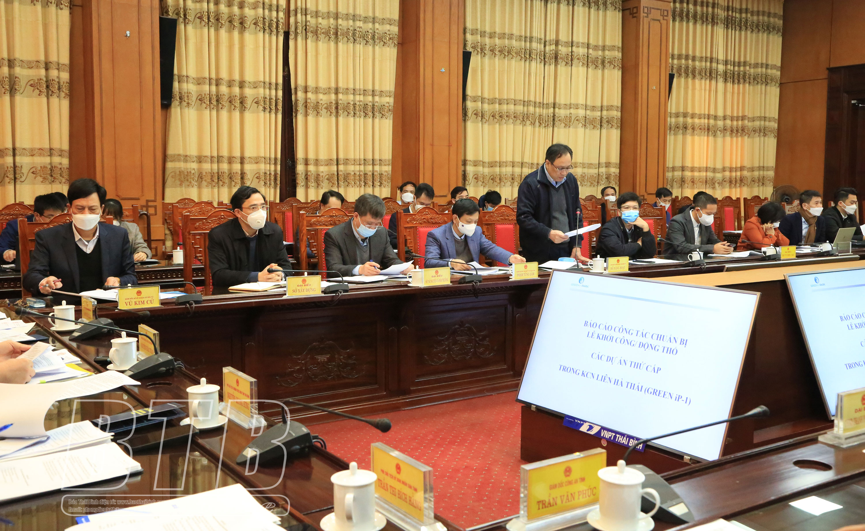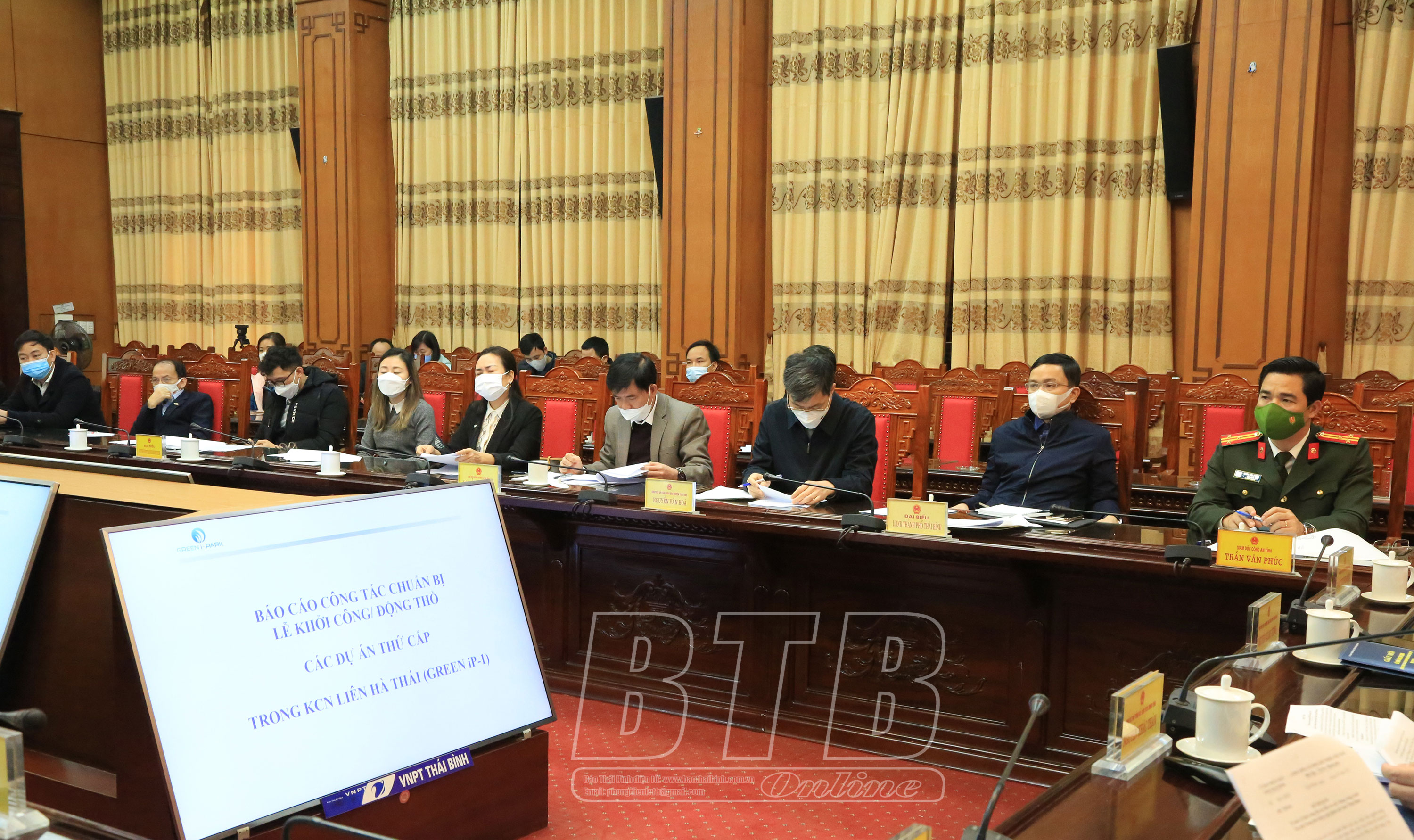 Tại cuộc họp, lãnh đạo Ban Quản lý khu kinh tế và các khu công nghiệp tỉnh báo cáo kế hoạch tổ chức lễ khởi công dự án nhà máy Lotes Thái Thụy Việt Nam, dự án nhà máy Ohsung Vina Thái Bình, lễ động thổ dự án xây dựng và kinh doanh cho thuê nhà xưởng Nam Tài tại khu công nghiệp Liên Hà Thái, huyện Thái Thụy; lãnh đạo Ban Quản lý dự án đầu tư xây dựng các công trình dân dụng và công nghiệp tỉnh báo cáo kế hoạch tổ chức lễ khởi công dự án đầu tư xây dựng công trình tòa nhà Trung tâm Kiểm soát bệnh tật tỉnh và đại diện Tập đoàn TH báo cáo kế hoạch tổ chức lễ động thổ dự án đầu tư nhà máy chế biến thực phẩm công nghệ cao tỉnh Thái Bình tại xã Quỳnh Trang, huyện Quỳnh Phụ. Việc tổ chức lễ khởi công, động thổ các dự án, công trình trên nhằm tạo sức lan tỏa trong thu hút đầu tư, tạo khí thế, động lực mới đồng thời thể hiện sự quan tâm của các cấp, các ngành trong thực hiện nhiệm vụ ngay từ đầu năm.