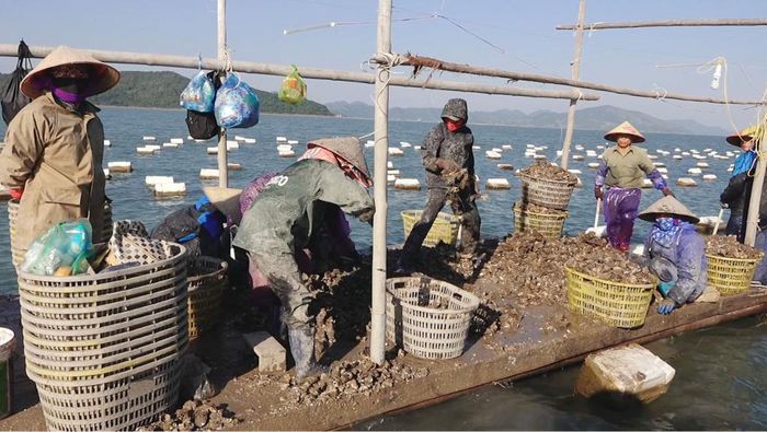 Người dân xã đảo Quan Lạn, huyện Vân Đồn thu hoạch hàu nuôi.